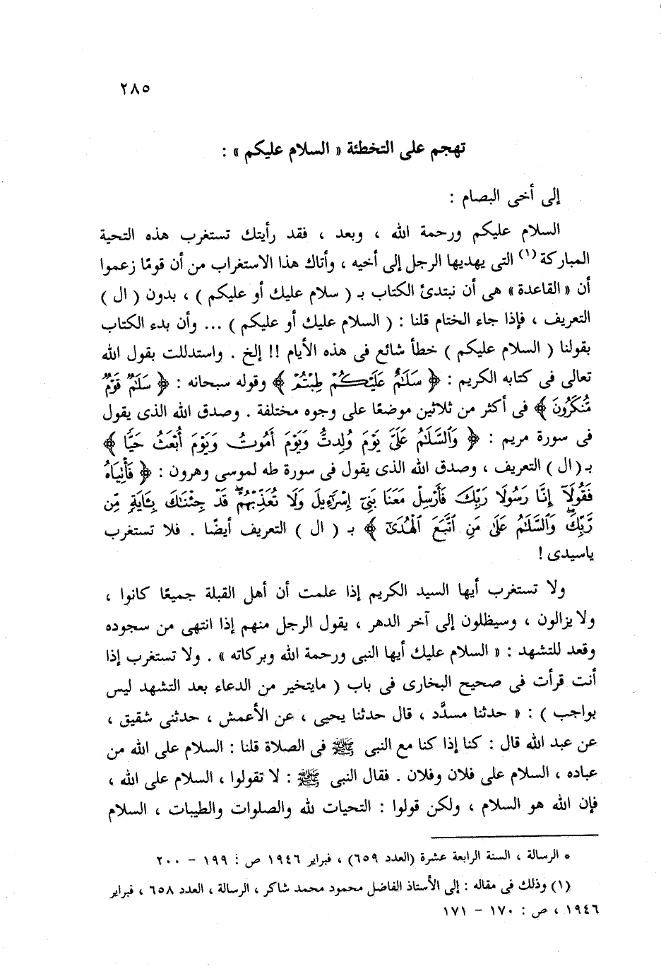السلام عليكم ورحمة الله، وبعد، فقد رأيتك تستغرب هذه التحية المباركة (¬1) التي يهديها الرجل إلى أخيه، وأتاك هذا الاستغراب من أن قومًا زعموا أن "القاعدة" هي أن نبتدئ الكتاب بـ (سلام عليك أو عليكم)، بدون (ال) التعريف، فإذا جاء الختام قلنا: (السلام عليك أو عليكم). . . وأن بدء الكتاب بقولنا (السلام عليكم) خطأ شائع في هذه الأيام! ! إلخ. واستدللت بقول الله تعالى في كتابه الكريم: {سَلَامٌ عَلَيْكُمْ طِبْتُمْ} وقوله سبحانه: {سَلَامٌ قَوْمٌ مُنْكَرُون} في أكثر من ثلاثين موضعًا على وجوه مختلفة. وصدق الله الذي يقول في سورة مريم: {وَالسَّلَامُ عَلَيَّ يَوْمَ وُلِدْتُ وَيَوْمَ أَمُوتُ وَيَوْمَ أُبْعَثُ حَيًّا} بـ (ال) التعريف، وصدق الله الذي يقول في سورة طه لموسى وهرون: {فَأْتِيَاهُ فَقُولَا إِنَّا رَسُولَا رَبِّكَ فَأَرْسِلْ مَعَنَا بَنِي إِسْرَائِيلَ وَلَا تُعَذِّبْهُمْ قَدْ جِئْنَاكَ بِآيَةٍ مِنْ رَبِّكَ وَالسَّلَامُ عَلَى مَنِ اتَّبَعَ الْهُدَى} بـ (ال) التعريف أيضًا. فلا تستغرب يا سيدي!