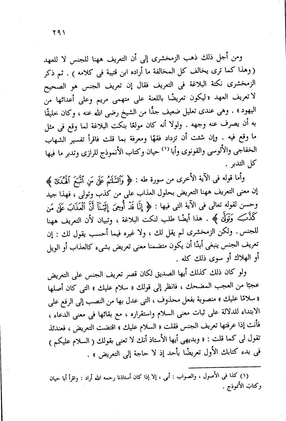 وأما قوله في الآية الأخرى من سورة طه: {وَالسَّلَامُ عَلَى مَنِ اتَّبَعَ الْهُدَى} إن معنى التعريف ههنا التعريض بحلول العذاب على من كذب وتولى، فهذا جيد وحسن لقوله تعالى في الآية التي فيها: {إِنَّا قَدْ أُوحِيَ إِلَيْنَا أَنَّ الْعَذَابَ عَلَى مَنْ كَذَّبَ وَتَوَلَّى}. هذا أيضًا طلب لنكت البلاغة، وتبيان لأن التعريف ههنا للجنس. ولكن الزمخشري لم يقل لك، ولا غيره فيما أحسب يقول لك: إن تعريف الجنس ينبغي أبدًا أن يكون متضمنا معنى تعريض بشيء كالعذاب أو الويل أو الهلاك أو سوى ذلك كله.