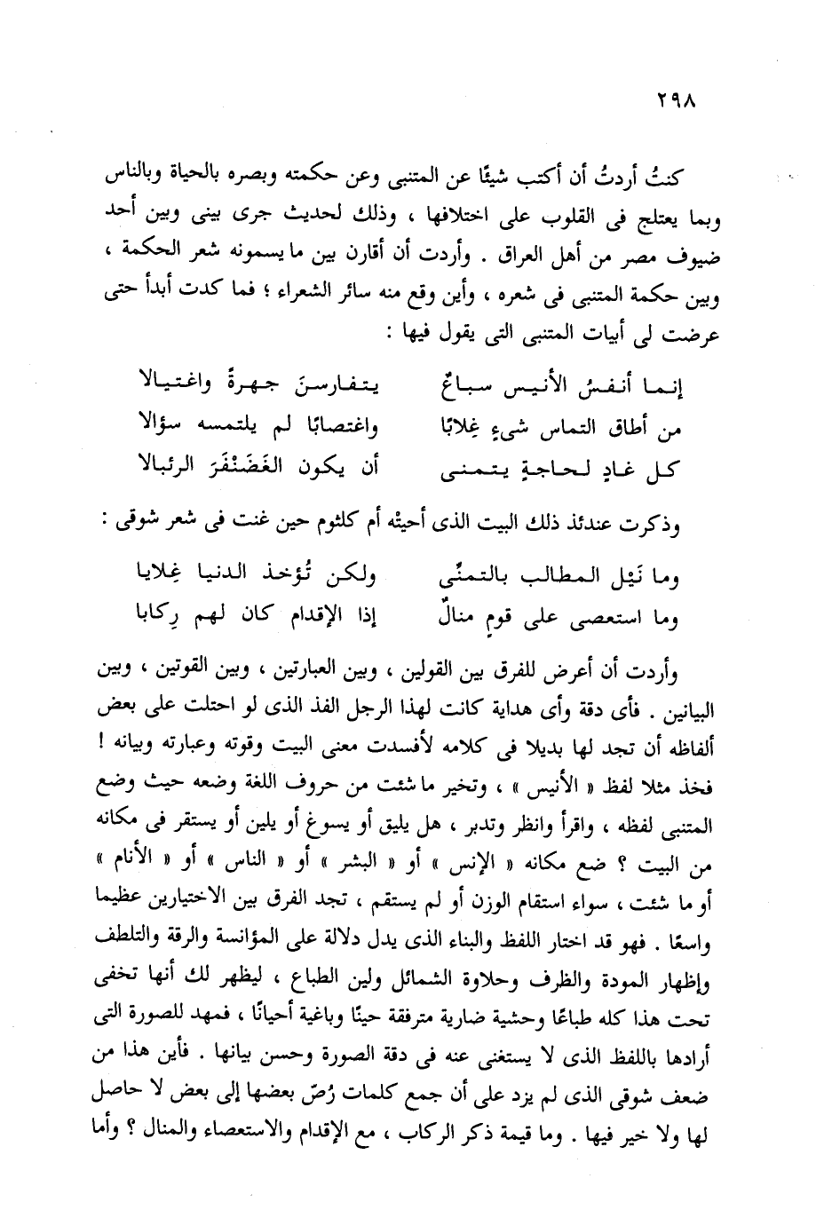 وأردت أن أعرض للفرق بين القولين، وبين العبارتين، وبين القوتين، وبين البيانين. فأي دقة وأي هداية كانت لهذا الرجل الفذ الذي لو احتلت على بعض ألفاظه أن تجد لها بديلا في كلامه لأفسدت معنى البيت وقوته وعبارته وبيانه! فخذ مثلا لفظ "الأنيس"، وتخير ما شئت من حروف اللغة وضعه حيث وضع المتنبي لفظه، واقرأ وانظر وتدبر، هل يليق أو يسوغ أو يلين أو يستقر في مكانه من البيت؟ ضع مكانه "الإنس" أو "البشر" أو "الناس" أو "الأنام" أو ما شئت، سواء استقام الوزن أو لم يستقم، تجد الفرق بين الاختيارين عظيما واسعًا. فهو قد اختار اللفظ والبناء الذي يدل دلالة على المؤانسة والرقة والتلطف وإظهار المودة والظرف وحلاوة الشمائل ولين الطباع، ليظهر لك أنها تخفي تحت هذا كله طباعًا وحشية ضارية مترفقة حينًا وباغية أحيانًا، فمهد للصورة التي أرادها باللفظ الذي لا يستغنى عنه في دقة الصورة وحسن بيانها. فأين هذا من ضعف شوقي الذي لم يزد على أن جمع كلمات رُصّ بعضها إلى بعض لا حاصل لها ولا خير فيها. وما قيمة ذكر الركاب، مع الإقدام والاستعصاء والمنال؟ وأما