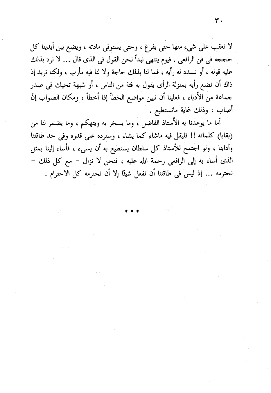 لا نعقب على شيء منها حتى يفرغ، وحتى يستوفي مادته، ويضع بين أيدينا كل حججه في فن الرافعي. فيوم ينتهي نبدأ نحن القول في الذي قال. . . . لا نرد بذلك عليه قوله، أو نسدد له رأيه، فما لنا بذلك حاجة ولا لنا فيه مأرب، ولكنا نريد إذ ذاك أن نضع رأيه بمنزلة الرأي يقول به فئة من الناس، أو شبهة تحيك في صدر جماعة من الأدباء، فعلينا أن نبين مواضع الخطأ إذا أخطأ، ومكان الصواب إنْ أصاب، وذلك غاية ما نستطيع.