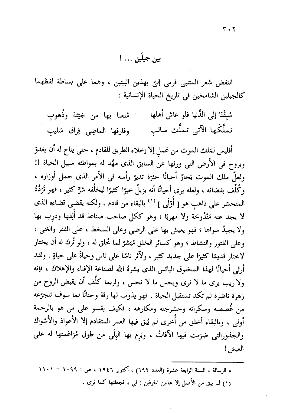(*) الرسالة، السنة الرابعة عشرة (العدد 692)، أكتوبر 1946، ص: 1099 - 1101