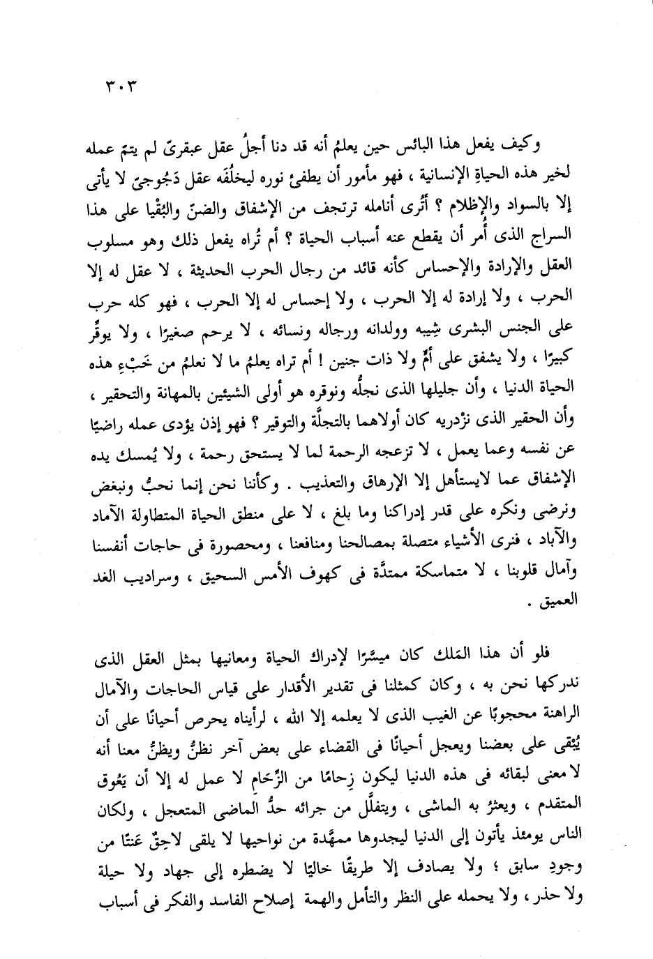 وكيف يفعل هذا البائس حين يعلمُ أنه قد دنا أجلُ عقل عبقريّ لم يتمّ عمله لخير هذه الحياةِ الإنسانية، فهو مأمور أن يطفئ نوره ليخلُفَه عقل دَجُوجيّ لا يأتي إلا بالسواد والإظلام؟ أتُرى أنامله ترتجف من الإشفاق والضن والبُقْيا على هذا السراج الذي أُمر أن يقطع عنه أسباب الحياة؟ أم تُراه يفعل ذلك وهو مسلوب العقل والإرادة والإحساس كأنه قائد من رجال الحرب الحديثة، لا عقل له إلا الحرب، ولا إرادة له إلا الحرب، ولا إحساس له إلا الحرب، فهو كله حرب على الجنس البشري شِيبه وولدانه ورجاله ونسائه، لا يرحم صغيرا، ولا يوقِّر كبيرًا، ولا يشفق على أم ولا ذات جنين! أم تراه يعلمُ ما لا نعلمُ من خَبْءِ هذه الحياة الدنيا، وأن جليلها الذي نجلُّه ونوقره هو أولى الشيئين بالمهانة والتحقير، وأن الحقير الذي نزْدريه كان أولاهما بالتجلَّة والتوقير؟ فهو إذن يؤدي عمله راضيًا عن نفسه وعما يعمل، لا تزعجه الرحمة لما لا يستحق رحمة، ولا يُمسك يده الإشفاق عما لا يستأهل إلا الإرهاق والتعذيب. وكأننا نحن إنما نحبُّ ونبغض ونرضى ونكره على قدر إدراكنا وما بلغ، لا على منطق الحياة المتطاولة الآماد والآباد، فنرى الأشياء متصلة بمصالحنا ومنافعنا، ومحصورة في حاجات أنفسنا وآمال قلوبنا، لا متماسكة ممتدَّة في كهوف الأمس السحيق، وسراديب الغد العميق.
