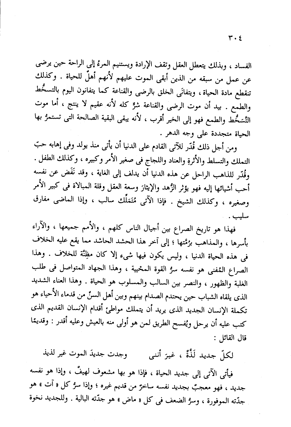 الفساد، وبذلك يتعطل العقل وتقف الإرادة ويستنيم المرءُ إلى الراحة حين يرضى عن عمل من سبقه من الذين أبقى الموت عليهم لأنهم أهلٌ للحياة. وكذلك تنقطع مادة الحياة، ويتفانَى الخلق بالرضى والقناعة كما يتفانون اليوم بالتسخُّط والطمع. بيد أن موت الرضى والقناعة شرٌّ كله لأنه عقيم لا ينتج، أما موت التَّسَخُّط والطمع فهو إلى الخير أقرب، لأنه يبقى البقية الصالحة التي تستمرُّ بها الحياة متجددة على وجه الدهر.