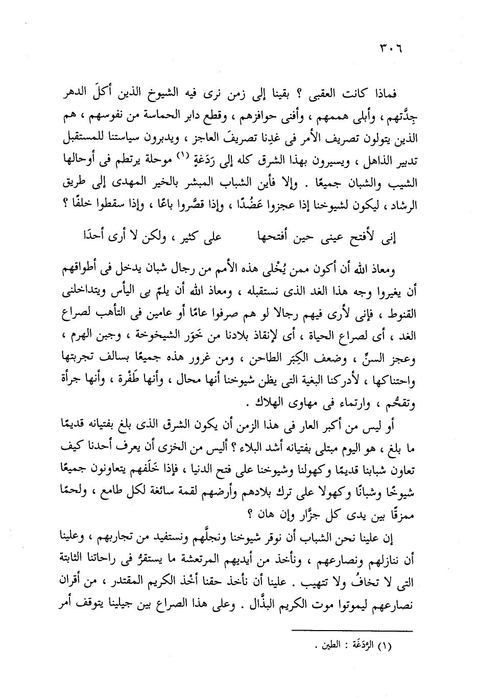 ومعاذ الله أن أكون ممن يُخْلي هذه الأمم من رجال شبان يدخل في أطواقهم أن يغيروا وجه هذا الغد الذي نستقبله، ومعاذ الله أن يلمّ بي اليأس ويتداخلني القنوط، فإني لأرى فيهم رجالا لو هم صرفوا عامًا أو عامين في التأهب لصراع الغد، أي لصراع الحياة، أي لإنقاذ بلادنا من خَوَر الشيخوخة، وجبن الهرم، وعجز السنِّ، وضعف الكِبَر الطاحن، ومن غرور هذه جميعًا بسالف تجربتها واحتناكها، لأدركنا البغية التي يظن شيوخنا أنها محال، وأنها طَفْرة، وأنها جرأة وتقحُّم، وارتماء في مهاوي الهلاك.