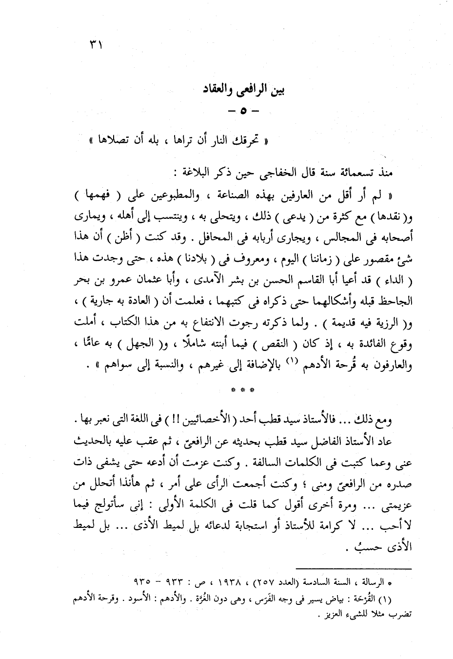 عاد الأستاذ الفاضل سيد قطب بحديثه عن الرافعي، ثم عقب عليه بالحديث عني وعما كتبت في الكلمات السالفة. وكنت عزمت أن أدعه حتى يشفى ذات صدره من الرافعيّ ومني؛ وكنت أجمعت الرأي على أمر، ثم هأنذا أتحلل من عزيمتي. . . ومرة أخرى أقول كما قلت في الكلمة الأولى: إني سأتولج فيما لا أحب. . لا كرامة للأستاذ أو استجابة لدعائه بل لميط الأذى. . . . بل لميط الأذى حسبُ.