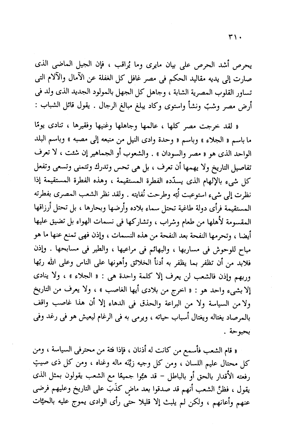 "لقد خرجت مصر كلها، عالمها وجاهلها وغنيها وفقيرها، تنادى يومًا ما باسم "الجلاء" وباسم "وحدة وادي النيل من منبعه إلى مصبه" وباسم البلد الواحد الذي هو "مصر والسودان". والشعوب أو الجماهير إن شئت، لا تعرف تفاصيل التاريخ ولا يهمها أن تعرف، بل هي تحس وتدرك وتتمنى وتسعى وتفعل كل شيء بالإلهام الذي يسدّده الفطرة المستقيمة، وهذه الفطرة المستقيمة إذا نظرت إلى شيء استوعبت لُبَّه وطرحت نُفايته. ولقد نظر الشعب المصري بفطرته المستقيمة فرأى دولة طاغية تحتل سماء بلاده وأرضها وبحارها، بل تحتل أرزاقها المقسومة لأهلها من طعام وشراب، وتشاركها في نسمات الهواء بل تضيق عليها أيضًا، وتحرمها النفحة بعد النفحة من هذه النسمات، وإذن فهي تمنع عنها ما هو مباح للوحوش في مساربها، والبهائم في مراعيها، والطير في مسابحها. وإذن فلابد من أن تظفر بما يظفر به أدنأ الخلائق وأهونها على الناس وعلى الله ربَّها وربهم وإذن فالشعب لن يعرف إلا كلمة واحدة هي: "الجلاء"، ولا ينادى إلا بشيء واحد هو: "اخرج من بلادي أيها الغاصب"، ولا يعرف من التاريخ ولا من السياسة ولا من البراعة والحذق في الدهاء إلا أن هذا غاصب واقف بالمرصاد يغتاله ويغتال أسباب حياته، ويرمى به في الرغام ليعيش هو في رغد وفي بحبوحة.