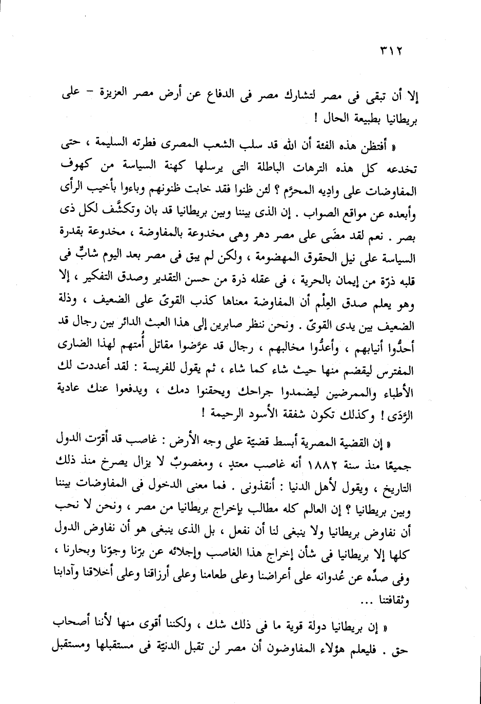 "إن القضية المصرية أبسط قضيّة على وجه الأرض: غاصب قد أقرّت الدول جميعًا منذ سنة 1882 أنه غاصب معتدٍ، ومغصوبٌ لا يزال يصرخ منذ ذلك التاريخ، ويقول لأهل الدنيا: أنقذوني. فما معنى الدخول في المفاوضات بيننا وبين بريطانيا؟ إن العالم كله مطالب بإخراج بريطانيا من مصر، ونحن لا نحب أن نفاوض بريطانيا ولا ينبغي لنا أن نفعل، بل الذي ينبغي هو أن نفاوض الدول كلها إلا بريطانيا في شأن إخراج هذا الغاصب وإجلائه عن برّنا وجوّنا وبحارنا، وفي صدِّه عن عُدوانه على أعراضنا وعلى طعامنا وعلى أرزاقنا وعلى أخلاقنا وآدابنا وثقافتنا. . .