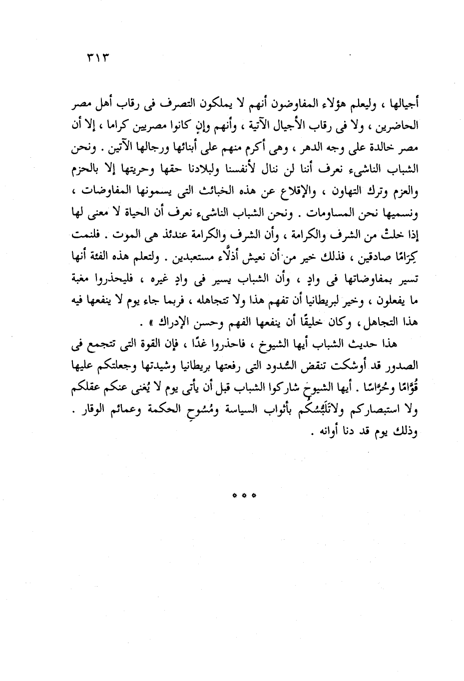 هذا حديث الشباب أيها الشيوخ، فاحذروا غدًا، فإن القوة التي تتجمع في الصدور قد أوشكت تنقض السُّدود التي رفعتها بريطانيا وشيدتها وجعلتكم عليها قُوَّامًا وحُرَّاسًا. أيها الشيوخ شاركوا الشباب قبل أن يأتي يوم لا يُغنى عنكم عقلكم ولا استبصاركم ولاتَلَبُّسُكم بأثواب السياسة ومُسُوح الحكمة وعمائم الوقار. وذلك يوم قد دنا أوانه.