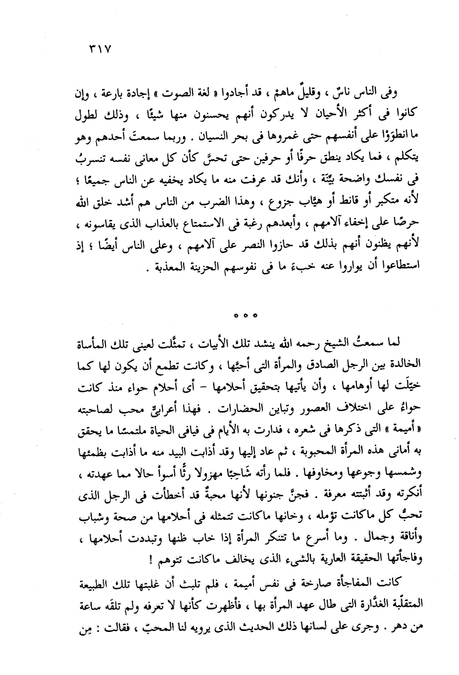 لما سمعت الشيخ -رحمه الله- ينشد تلك الأبيات، تمثَّلت لعيني تلك المأساة الخالدة بين الرجل الصادق والمرأة التي أحبَّها، وكانت تطمع أن يكون لها كما خيّلَت لها أوهامها، وأن يأتيها بتحقيق أحلامها -أي أحلام حواء منذ كانت حواءُ على اختلاف العصور وتباين الحضارات. فهذا أعرابيٌّ محب لصاحبته "أميمة" التي ذكرها في شعره، فدارت به الأيام في فيافي الحياة ملتمسًا ما يحقق به أماني هذه المرأة المحبوبة، ثم عاد إليها وقد أذابت البيد منه ما أذابت بظمئها وشمسها وجوعها ومخاوفها. فلما رأته شاحِبًا مهزولا رثًّا أسوأ حالا مما عهدته، أنكرته وقد أثبتته معرفة. فجنَّ جنونها لأنها محبةٌ قد أخطأت في الرجل الذي تحسب كل ما كانت تؤمله، وخانها ما كانت تتمثله في أحلامها من صحة وشباب وأناقة وجمال. وما أسرع ما تتنكر المرأة إذا خاب ظنها وتبددت أحلامها، وفاجأتها الحقيقة العارية كالشيء الذي يخالف ما كانت تتوهم!