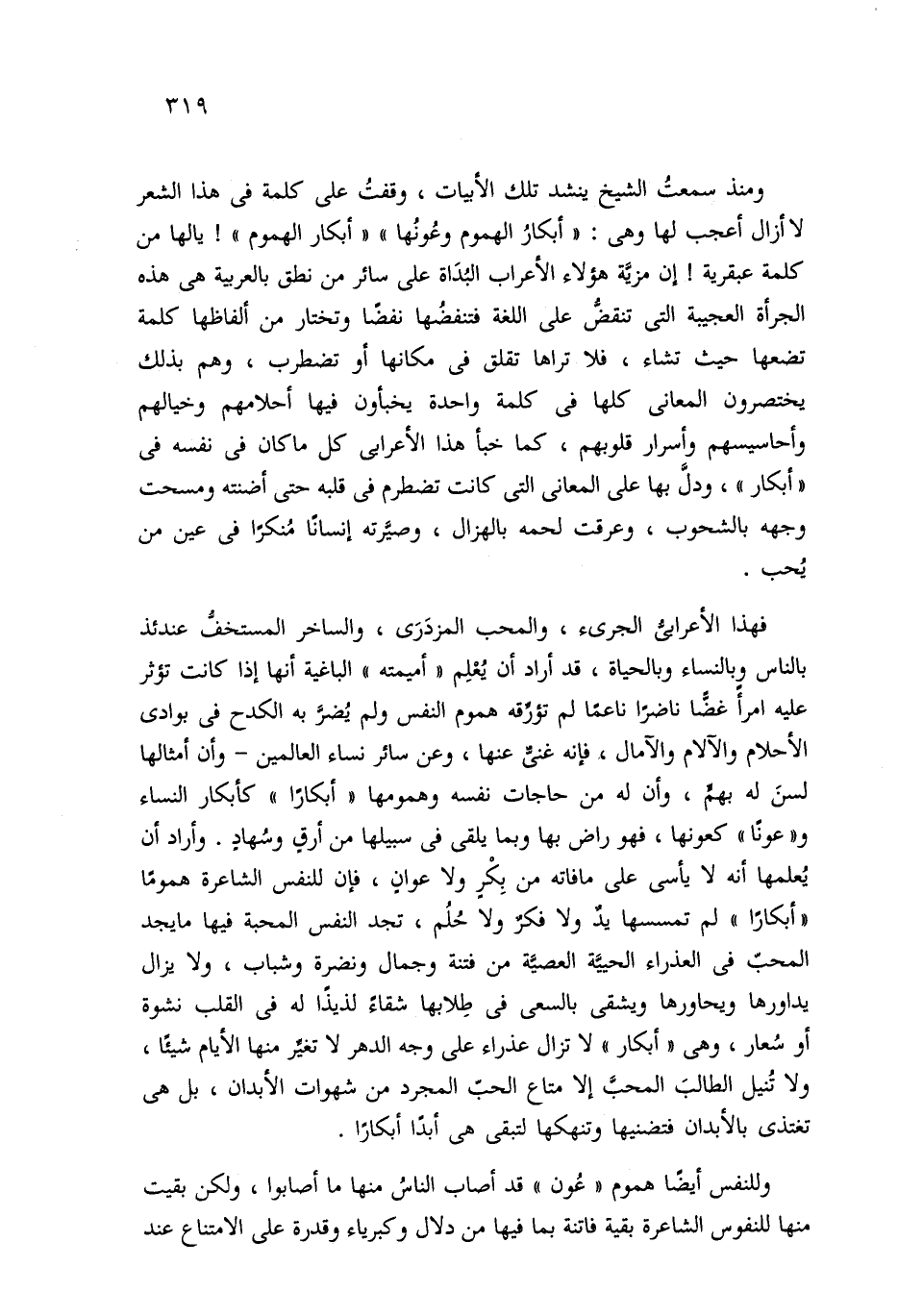 ومنذ سمعتُ الشيخ ينشد تلك الأبيات، وقفتُ على كلمة في هذا الشعر لا أزال أعجب لها وهي: "أبكارُ الهموم وعُونُها" "أبكار الهموم"! يا لها من كلمة عبقرية! إن مزيَّة هؤلاء الأعراب البُدَاة على سائر من نطق بالعربية هي هذه الجرأة العجيبة التي تنقضُّ على اللغة فتنفضُها نفضًا وتختار من ألفاظها كلمة تضعها حيث تشاء، فلا تراها تقلق في مكانها أو تضطرب، وهم بذلك يختصرون المعاني كلها في كلمة واحدة يخبأون فيها أحلامهم وخيالهم وأحاسيسهم وأسرار قلوبهم، كما خبأ هذا الأعرابي كل ما كان في نفسه في "أبكار"، ودلَّ بها على المعاني التي كانت تضطرم في قلبه حتى أضنته ومسحت وجهه بالشحوب، وعرقت لحمه بالهزال، وصيَّرته إنسانًا مُنكرًا في عين من يُحب.