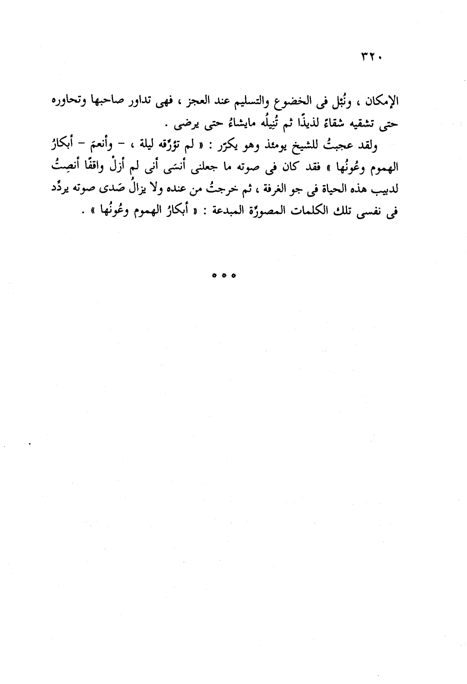 ولقد عجبتُ للشيخ يومئذ وهو يكرّر: "لم تؤرِّقه ليلة، -وأنعمَ- أبكارُ الهموم وعُونُها" فقد كان في صوته ما جعلني أنسَى أني لم أزلْ واقفًا أنصتُ لدبيب هذه الحياة في جو الغرفة، ثم خرجتُ من عنده ولا يزالُ صَدى صوته يردِّد في نفسي تلك الكلمات المصورِّة المبدعة: "أبكارُ الهموم وعُونُها".