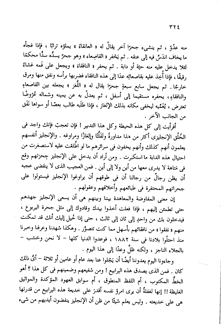 وجاءونا اليوم يعدوننا أيضًا أن يَجْلوا عنا بعد عام أو عامين أو ثلاثة -أيُّ ذلك كان. فمن الذي يصدق هذه اليرابيع! ومن شفيعهم وضمينهم في كل هذا؟ أهو الخطُّ المكتوب، أم اللفظ المنطوق، أم سوابق العهود المؤكدة والمواثيق الغليظة! ! إنها لغفلةٌ أن يرى امرؤ نفسه أقدرَ على خديعة هذه اليرابيع من قدرتها هي على خديعته. وليس يعلم شيئًا من ظن أن الإنجليز ينفضون أيديهم من شيء
