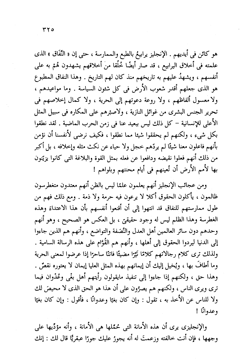 ومن عجائب الإنجليز أنهم يعلمون علمًا ليس بالظن أنهم معتدون متغطرسون ظالمون، يأكلون الحقوق أكلا لا يرعون فيه حرمة ولا ذمة. ومع ذلك فهم من طول ممارستهم للنفاق قد انتهوا إلى أن أقنعوا أنفسهم بأن هذا الاعتداءَ وهذه الغطرسة وهذا الظلم ليس له وجود حقيقيّ، بل العكس هو الصحيح، وهو أنهم وحدهم دون سائر العالمين أهل العدل والنَّصَفة والتواضع، وأنهم هم الذين جاءوا إلى الدنيا ليردوا الحقوق إلى أهلها، وأنهم هم القُوَّام على هذه الرسالة السامية. ولذلك ترى كلام رجالاتهم كلامًا نَيرًا مضيئًا فاتنًا ساحرًا إذا عرضوا لمعنى الحرية وما أطافَ بها، ويُخيل إليك أن إيمانهم بهذه المثل العليا إيمان لا يعتوره نقصٌ. وهذا حق، ولكنهم إذا جاءوا إلى تنفيذ ما يقولون رأيتهم أهل بغْى وعُدْوان فيما ترى ويرى الناس، ولكنهم هم يصرّون على أن هذا هو الحق الذي لا محيصَ لك ولا للناس عن الأخذ به، تقول: وإن كان بغيًا وعدوانًا، فأقول: وإن كان بغيًا وعدوانًا!