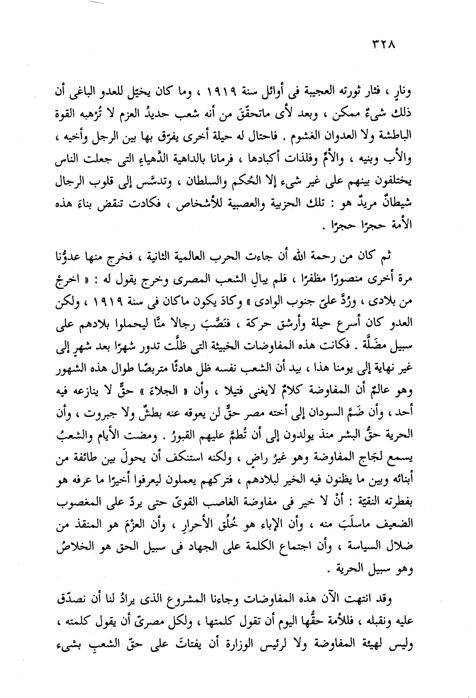 وقد انتهت الآن هذه المفاوضات وجاءنا المشروع الذي يرادُ لنا أن نصدّق عليه ونقبله، فللأمة حقُّها اليوم أن تقول كلمتها، ولكل مصريّ أن يقول كلمته، وليس لهيئة المفاوضة ولا لرئيس الوزارة أن يفتاتَ على حق الشعبِ بشيء
