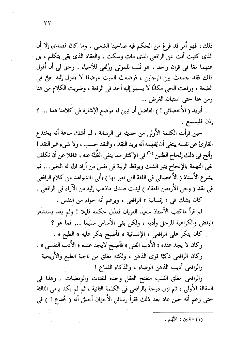 ذلك، فهو أمر قد فرغ من الحكم فيه صاحبنا الشعبيّ. وما كان قصدي إلا أن الذي كتبت أنت عن الرافعي الذي مات وسكت، والعقاد الذي بقى يتكلم، بل عنهما معًا في قران واحد، هو ثَلب للموتى وزُلفى للأحياء. وحق لي أن أقول ذلك فقد جمعتَ بين الرجلين، فوضعتَ الميت موضعًا لا يتنزل إليه حيٌّ في الضعة، ورفعت الحي مكانًا لا يسمو إليه أحد في الرفعة، وضربت الكلام من هنا ومن هنا حتى استبان الغرض ..