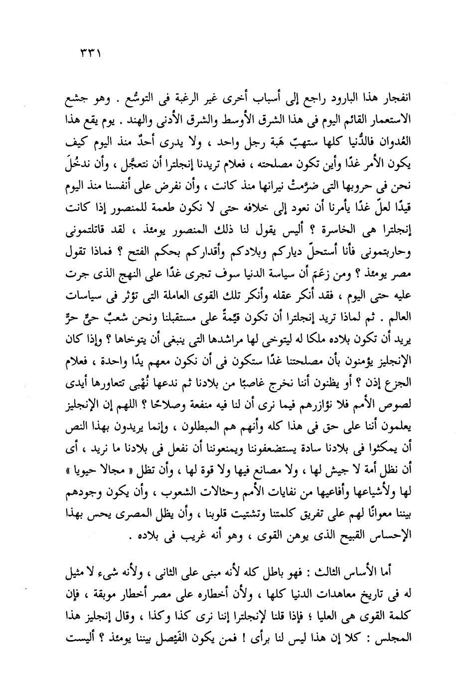 انفجار هذا البارود راجع إلى أسباب أخرى غير الرغبة في التوسُّع. وهو جشع الاستعمار القائم اليوم في هذا الشرق الأوسط والشرق الأدنى والهند. يوم يقع هذا العُدوان فالدنيا كلها ستهبّ هَبة رجل واحد، ولا يدرى أحدٌ منذ اليوم كيف يكون الأمر غدًا وأين تكون مصلحته، فعلام تريدنا إنجلترا أن نتعجَّل، وأن ندخُلَ نحن في حروبها التي ضرَّمتْ نيرانها منذ كانت، وأن نفرض على أنفسنا منذ اليوم قيدًا لعل غدًا يأمرنا أن نعود إلى خلافه حتى لا نكون طعمة للمنصور إذا كانت إنجلترا هي الخاسرة؟ أليس يقول لنا ذلك المنصور يومئذ، لقد قاتلتموني وحاربتموني فأنا أستحلّ دياركم وبلادكم وأقداركم بحكم الفتح؟ فماذا تقول مصر يومئذ؟ ومن زعَمَ أن سياسة الدنيا سوف تجرى غدًا على النهج الذي جرت عليه حتى اليوم، فقد أنكر عقله وأنكر تلك القوى العاملة التي تؤثر في سياسات العالم. ثم لماذا تريد إنجلترا أن تكون قيمة على مستقبلنا ونحن شعبٌ حيٍّ حرٌّ يريد أن تكون بلاده ملكا له ليتوخى لها مراشدها التي ينبغي أن يتوخاها؟ وإذا كان الإنجليز يؤمنون بأن مصلحتنا غدًا ستكون في أن نكون معهم يدًا واحدة، فعلام الجزع إذن؟ أو يظنون أننا نخرج غاصبًا من بلادنا ثم ندعها نُهْبى تتعاورها أيدي لصوص الأمم فلا نؤازرهم فيما نرى أن لنا فيه منفعة وصلاحًا؟ اللهم إن الإنجليز يعلمون أننا على حق في هذا كله وأنهم هم المبطلون، وإنما يريدون بهذا النص أن يمكثوا في بلادنا سادة يستضعفوننا ويمنعوننا أن نفعل في بلادنا ما نريد، أي أن نظل أمة لا جيش لها، ولا مصانع فيها ولا قوة لها، وأن تظل "مجالا حيويًا" لها ولأشياعها وأفاعيها من نفايات الأمم وحثالات الشعوب، وأن يكون وجودهم بيننا معوانًا لهم على تفريق كلمتنا وتشتيت قلوبنا، وأن يظل المصري يحس بهذا الإحساس القبيح الذي يوهن القوى، وهو أنه غريب في بلاده.