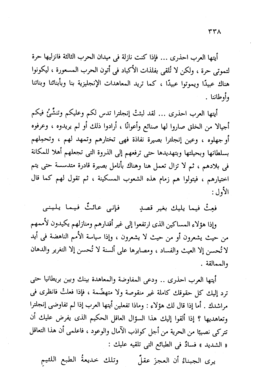 أيتها العرب احذري. . . فإذا كنت نازلة في ميدان الحرب الثالثة فانزليها حرة لتموتي حرة، ولكن لا تُلقى بفلذات الأكباد في أتون الحرب المسعورة، ليكونوا هناك عبيدًا ويموتوا عبيدًا، كما تريد المعاهدات الإنجليزية بنا وبأبنائنا وبناتنا وأوطاننا.