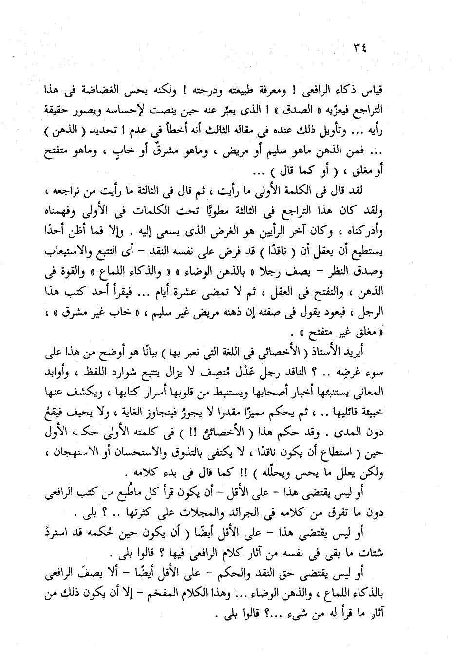 أو ليس يقتضي حق النقد والحكم -على الأقل أيضًا- ألا يصفَ الرافعي بالذكاء اللماع، والذهن الوضاء. . . . وهذا الكلام المفخم -إلا أن يكون ذلك من آثار ما قرأ له من شيء. . . .؟ قالوا بلى.