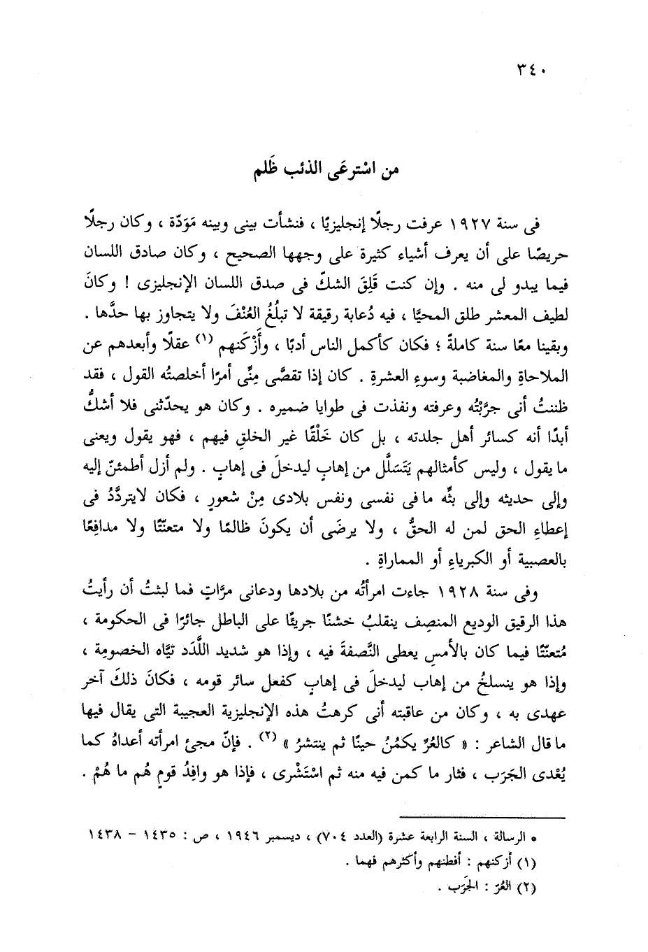 وفي سنة 1928 جاءت امرأتُه من بلادها ودعاني مرَّاتٍ فما لبثتُ أن رأيتُ هذا الرقيق الوديع المنصِف ينقلبُ خشنًا جريئًا على الباطل جائرًا في الحكومة، مُتعنتًا فيما كان بالأمسِ يعطي النَّصفةَ فيه، وإذا هو شديد اللَّدَد تيَّاه الخصومِة، وإذا هو ينسلخُ من إهاب ليدخلَ في إهابٍ كفعل سائر قومه، فكانَ ذلكَ آخر عهدي به، وكان من عاقبته أني كرهتُ هذه الإنجليزية العجيبة التي يقال فيها ما قال الشاعر: "كالعُرِّ يكمُنُ حينًا ثم ينتشرُ" (¬2). فإنّ مجئ امرأته أعداهُ كما يُعْدى الجَرَب، فثار ما كمن فيه منه ثم اسْتَشْرى، فإذا هو وافِدُ قومٍ هُم ما هُمْ.