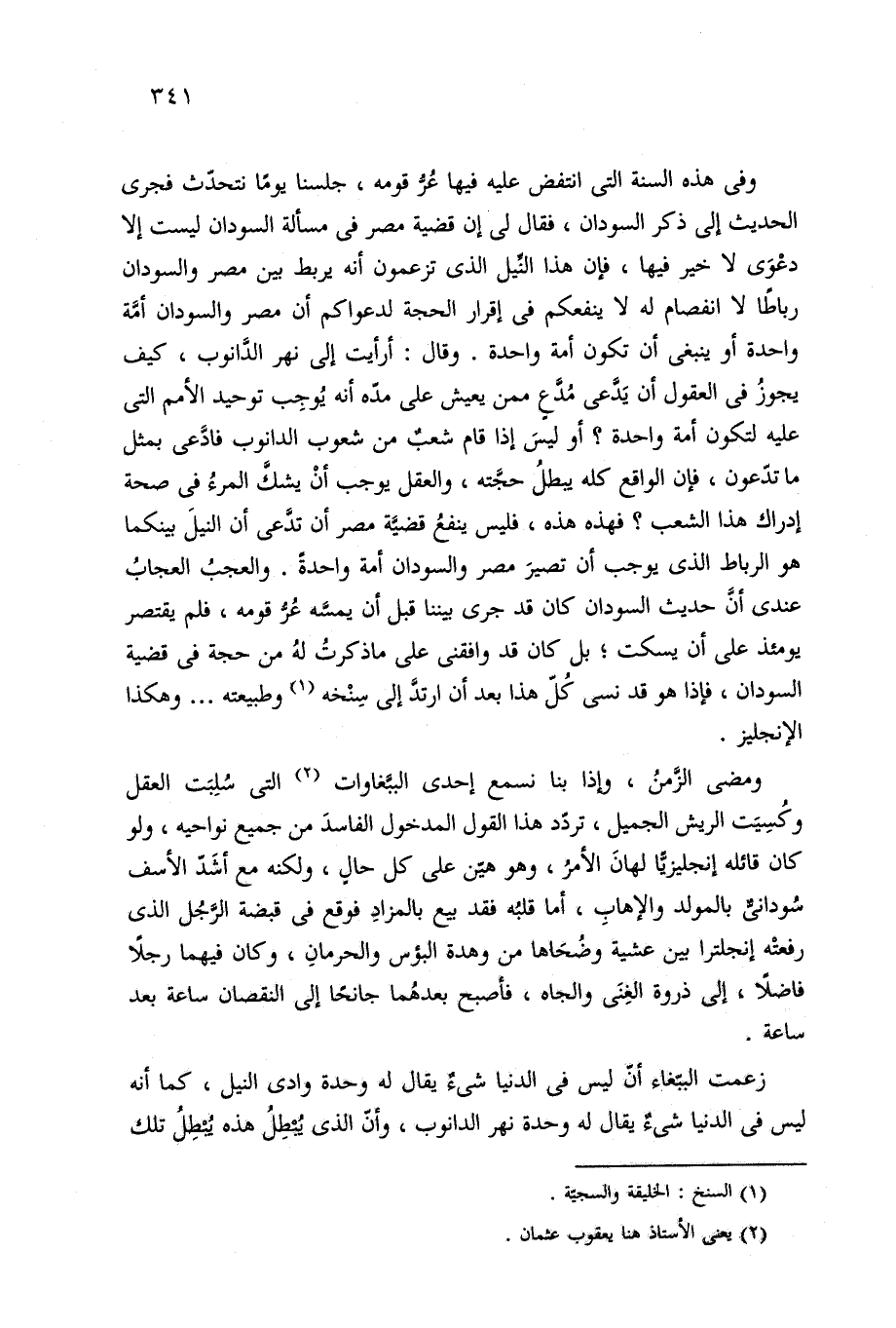 وفي هذه السنة التي انتفض عليه فيها عُرُّ قومه، جلسنا يومًا نتحدّث فجرى الحديث إلى ذكر السودان، فقال لي إن قضية مصر في مسألة السودان ليست إلا دعْوَى لا خير فيها، فإن هذا النَّيل الذي تزعمون أنه يربط بين مصر والسودان رباطًا لا انفصام له لا ينفعكم في إقرار الحجة لدعواكم أن مصر والسودان أمَّة واحدة أو ينبغي أن تكون أمة واحدة. وقال: أرأيت إلى نهر الدَّانوب، كيف يجوزُ في العقول أن يَدعى مُدَّعٍ ممن يعيش على مدّه أنه يُوجِب توحيد الأمم التي عليه لتكون أمة واحدة؟ أو ليسَ إذا قام شعبٌ من شعوب الدانوب فادَّعى بمثل ما تدّعون، فإن الواقع كله يبطلُ حجَّته، والعقل يوجب أنْ يشكَّ المرءُ في صحة إدراك هذا الشعب؟ فهذه هذه، فليس ينفعُ قضيَّة مصر أن تدَّعى أن النيلَ بينكما هو الرباط الذي يوجب أن تصيرَ مصر والسودان أمة واحدةً. والعجبُ العجابُ عندي أنَّ حديث السودان كان قد جرى بيننا قبل أن يمسَّه عُرُّ قومه، فلم يقتصر يومئذ على أن يسكت؛ بل كان قد وافقني على ما ذكرتُ لهُ من حجة في قضية السودان، فإذا هو قد نسى كُلّ هذا بعد أن ارتدَّ إلى سِنْخه (¬1) وطبيعته. . . وهكذا الإنجليز.