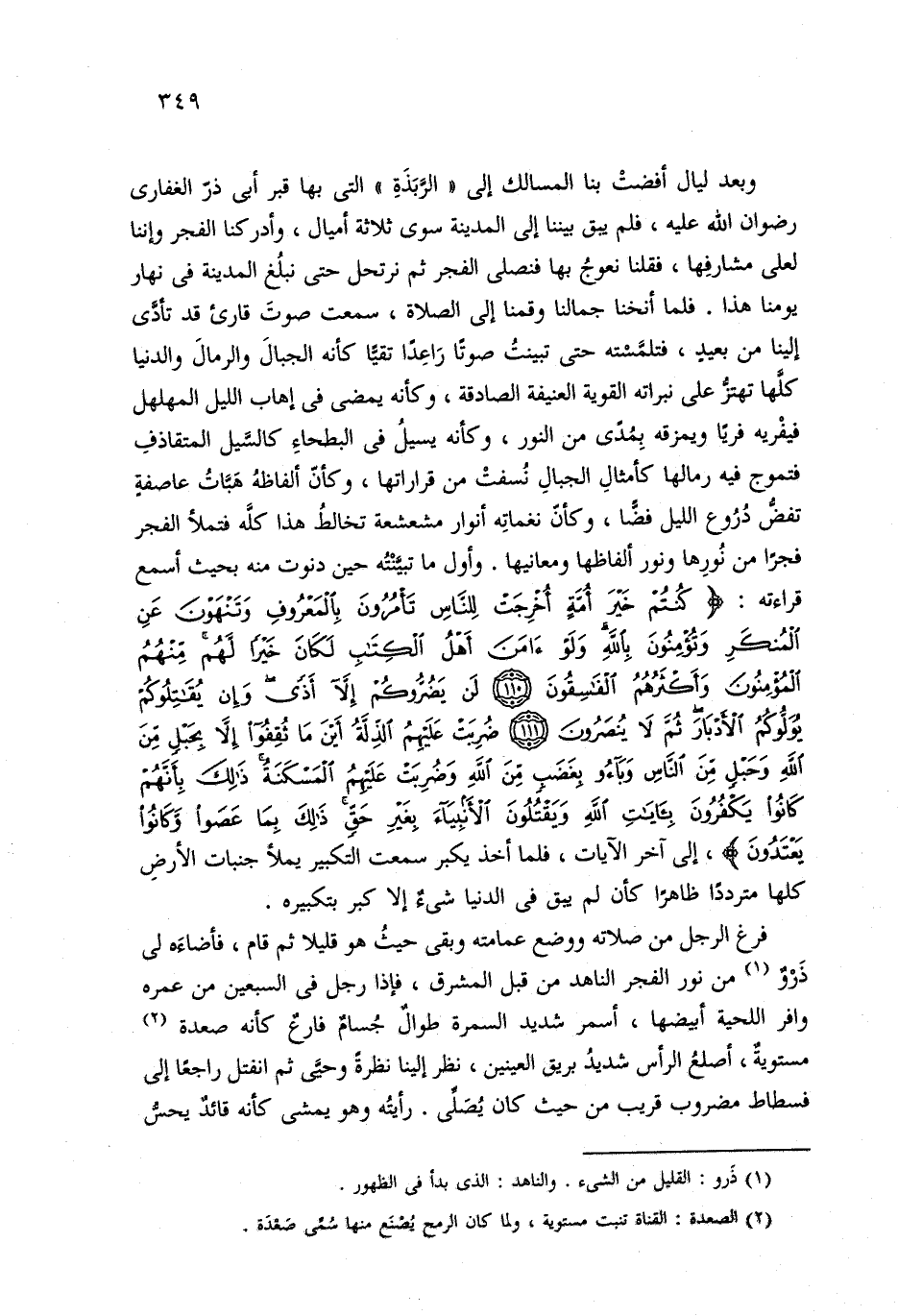 وبعد ليال أفضتْ بنا المسالك إلى "الرَّبَذَةِ" التي بها قبر أبي ذرّ الغفاري رضوان الله عليه، فلم يبق بيننا إلى المدينة سوى ثلاثة أميال، وأدركنا الفجر وإننا لعلى مشارفِها، فقلنا نعوجُ بها فنصلي الفجر ثم نرتحل حتى نبلُغ المدينة في نهار يومنا هذا. فلما أنخنا جمالنا وقمنا إلى الصلاة، سمعت صوتَ قارئ قد تأدَّى إلينا من بعيدٍ، فتلمَّسته حتى تبينتُ صوتًا رَاعِدًا تقيًّا كأنه الجبالَ والرمالَ والدنيا كلَّها تهتزُّ على نبراته القوية العنيفة الصادقة، وكأنه يمضي في إهاب الليل المهلهل فيفْريه فريًا ويمزقه بِمُدى من النور، وكأنه يسيلُ في البطحاءِ كالسَّيل المتقاذفِ فتموج فيه رمالها كأمثالِ الجبالِ نُسفتْ من قراراتها، وكأنّ ألفاظهُ هَبَّاتُ عاصفة تفضُّ دُرُوع الليل فضًّا، وكأنّ نغماتِه أنوار مشعشعة تخالطُ هذا كلَّه فتملأ الفجر فجرًا من نُورِها ونور ألفاظها ومعانيها. وأول ما تبيّنْتُه حين دنوت منه بحيث أسمع قراءته: {كُنْتُمْ خَيْرَ أُمَّةٍ أُخْرِجَتْ لِلنَّاسِ تَأْمُرُونَ بِالْمَعْرُوفِ وَتَنْهَوْنَ عَنِ الْمُنْكَرِ وَتُؤْمِنُونَ بِاللَّهِ وَلَوْ آمَنَ أَهْلُ الْكِتَابِ لَكَانَ خَيْرًا لَهُمْ مِنْهُمُ الْمُؤْمِنُونَ وَأَكْثَرُهُمُ الْفَاسِقُونَ (110) لَنْ يَضُرُّوكُمْ إِلَّا أَذًى وَإِنْ يُقَاتِلُوكُمْ يُوَلُّوكُمُ الْأَدْبَارَ ثُمَّ لَا يُنْصَرُونَ (111) ضُرِبَتْ عَلَيْهِمُ الذِّلَّةُ أَيْنَ مَا ثُقِفُوا إِلَّا بِحَبْلٍ مِنَ اللَّهِ وَحَبْلٍ مِنَ النَّاسِ وَبَاءُوا بِغَضَبٍ مِنَ اللَّهِ وَضُرِبَتْ عَلَيْهِمُ الْمَسْكَنَةُ ذَلِكَ بِأَنَّهُمْ كَانُوا يَكْفُرُونَ بِآيَاتِ اللَّهِ وَيَقْتُلُونَ الْأَنْبِيَاءَ بِغَيْرِ حَقٍّ ذَلِكَ بِمَا عَصَوْا وَكَانُوا يَعْتَدُونَ (112)} , إلى آخر الآيات، فلما أخذ يكبر سمعت التكبير يملأ جنبات الأرضِ كلها مترددًا ظاهرًا كأن لم يبق في الدنيا شيء إلا كبر بتكبيره.