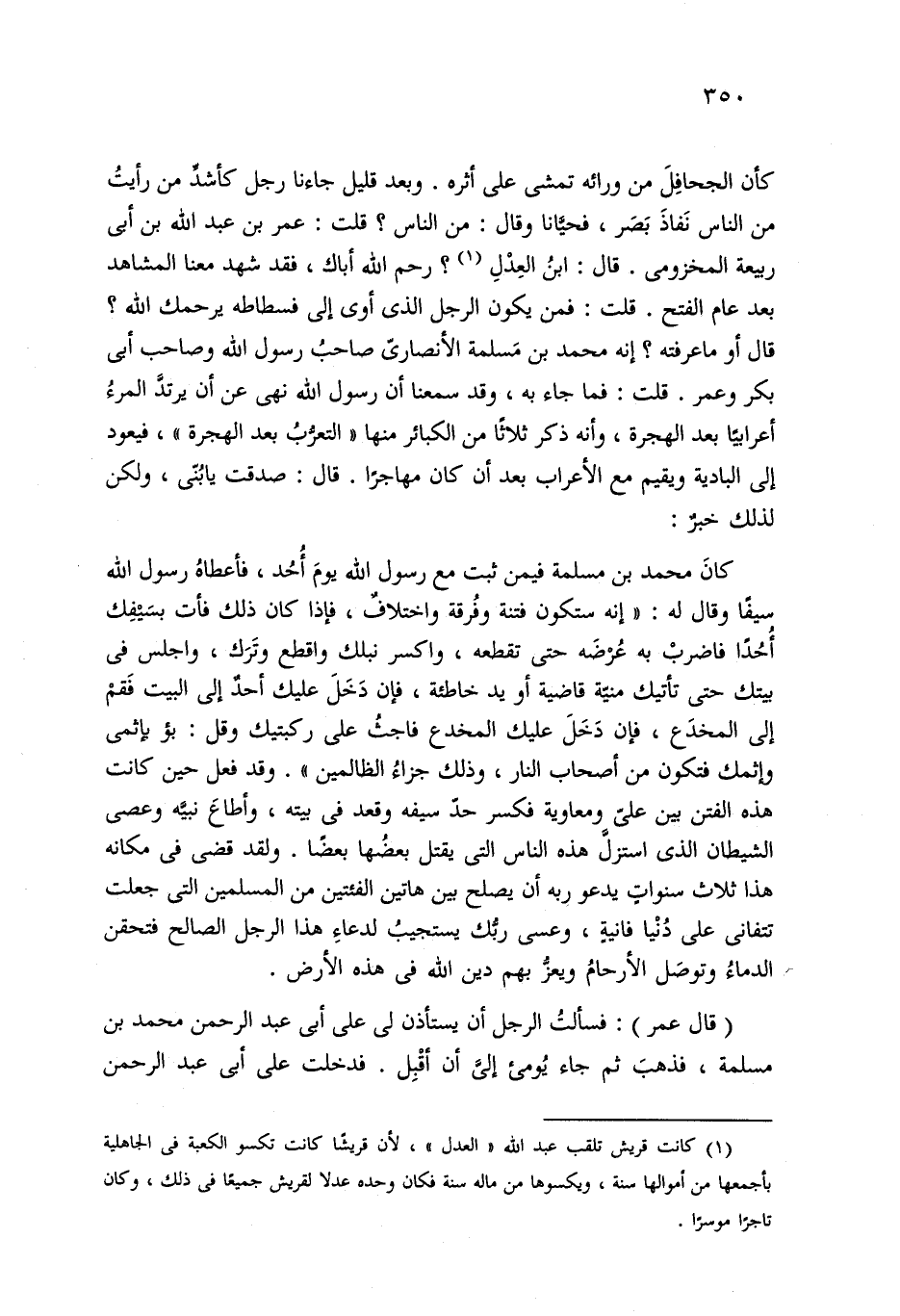 كأن الجحافِلَ من ورائه تمشي على أثره. وبعد قليل جاءنا رجل كأشد من رأيتُ من الناس نَفاذَ بَصَر، فحيَّانا وقال: من الناس؟ قلت: عمر بن عبد الله بن أبي ربيعة المخزومى. قال: ابنُ العِدْلِ (¬1)؟ رحم الله أباك، فقد شهد معنا المشاهد بعد عام الفتح. قلت: فمن يكون الرجل الذي أوى إلى فسطاطه يرحمك الله؟ قال أو ما عرفته؟ إنه محمد بن مَسلمة الأنصاري صاحبُ رسول الله وصاحب أبي بكر وعمر. قلت: فما جاء به، وقد سمعنا أن رسول الله نهى عن أن يرتدَّ المرءُ أعرابيًا بعد الهجرة، وأنه ذكر ثلاثًا من الكبائر منها "التعرُّبُ بعد الهجرة"، فيعود إلى البادية ويقيم مع الأعراب بعد أن كان مهاجرًا. قال: صدقت يا بُني، ولكن لذلك خبرٌ:
