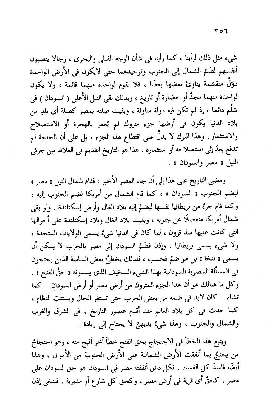 ومضى التاريخ على هذا إلى أن جاء العصر الأخير، فقام شمال النيل "مصر" ليضم الجنوب "السودان"، كما قام الشمال من أمريكا لضم الجنوب إليه، وكما قام جزءٌ من بريطانيا نفسها ليضمَّ إليه بلاد الغال وأرض إسكتلندة. ولو بقى شمال أمريكا منفصلًا عن جنوبه، وبقيت بلاد الغال وبلاد إسكتلندة على أحوالها التي كانت عليها منذ قرون، لما كان في الدنيا شيءٌ يسمى الولايات المتحدة، ولا شيء يسمى بريطانيا. وإذن فضَمُّ السودان إلى مصر بالحرب لا يمكن أن يسمى "فتحًا" بل هو ضمٌّ فحسب، فلذلك يخطئ بعض الساسة الذين يحتجون في المسألة المصرية السودانية بهذا الشيء السخيف الذي يسمونه "حق الفتح". وكل ما هنالك هو أن هذا الجزء المتروك من أرض مصر أو أرض السودان -كما تشاء- كان لابد في ضمه من بعض الحرب حتى تستقر الحال ويستتبّ النظام، كما حدث في كل بلاد العالم منذ أقدم عصور التاريخ، في الشرق والغرب والشمال والجنوب، وهذا شيءٌ بديهيّ لا يحتاج إلى زيادة.