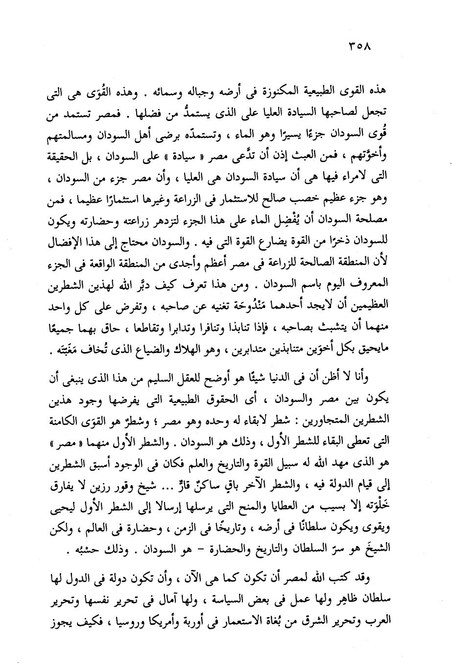وأنا لا أظن أن في الدنيا شيئًا هو أوضح للعقل السليم من هذا الذي ينبغي أن يكون بين مصر والسودان، أي الحقوق الطبيعية التي يفرضها وجود هذين الشطرين المتجاورين: شطر لا بقاء له وحده وهو مصر؛ وشطرٌ هو القوَى الكامنة التي تعطى البقاء للشطر الأول، وذلك هو السودان. والشطر الأول منهما "مصر" هو الذي مهد الله له سبيل القوة والتاريخ والعلم فكان في الوجود أسبق الشطرين إلى قيام الدولة فيه، والشطر الآخر باقٍ ساكنٌ قار. . . شيخ وقور رزين لا يفارق خَلْوَته إلا بسيب من العطايا والمنح التي يرسلها إرسالا إلى الشطر الأول ليحيى ويقوى ويكون سلطانًا في أرضه، وتاريخًا في الزمن، وحضارة في العالم، ولكن الشيخَ هو سرّ السلطان والتاريخ والحضارة - هو السودان. وذلك حسْبُه.