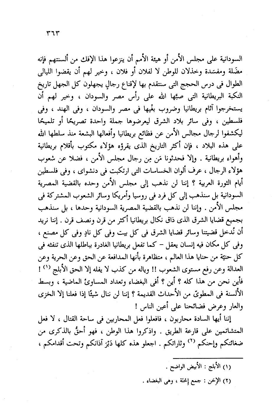 السودانية على مجلس الأمن أو هيئة الأمم أن ينزعوا هذا الإفك من ألسنتهم فإنه مضَلة ومفسَدة وخذلان للوطن لا لفلان أو فلان، وخير لهم أن يقضوا الليالي الطوال في درس الحجج التي سنتقدم بها لإقناع رجال يجهلون كل الجهل تاريخ النكبة البريطانية التي صبَّها الله على رأس مصر والسودان، وخير لهم أن يستخرجوا آثام بريطانيا وضروب بغْيها في مصر والسودان، وفي الهند، وفي فلسطين، وفي سائر بلاد الشرق ليعرضوها جملة واحدة تصريحًا أو تلميحًا ليكشفوا لرجال مجالس الأمن عن فظائع بريطانيا وأفعالها البشعة منذ سلطها الله على هذه البلاد، فإن أكثر التاريخ الَّذي يقرؤه هؤلاء مكتوب بأقلام بريطانية وأهواء بريطانية. وإلا فحدثونا مَن مِن رجال مجلس الأمن، فضلا عن شعوب هؤلاء الرجال، عرف ألوان الخساسات التي ارتكبت في دنشواي، وفي فلسطين أيام الثورة العربية؟ إننا لن نذهب إلى مجلس الأمن وحده بالقضية المصرية السودانية بل سنذهب إلى كل فرد في روسيا وأمريكا وسائر الشعوب المشتركة في مجلس الأمن. وإننا لن نذهب بالقضية المصرية السودانية وحدها، بل سنذهب بجميع قضايا الشرق الَّذي ذاق نكال بريطانيا أكثر من قرن ونصف قرن. إننا نريد أن نُدخل قضيتنا وسائر قضايا الشرق في كل بيت وفي كل نادٍ وفي كل مصنع، وفي كل مكان فيه إنسان يعقل -كما تفعل بريطانيا الغادرة بباطلها الَّذي تنفثه في كل حنيَّة من حنايا هذا العالم، متظاهرة بأنها المدافعة عن الحق وعن الحرية وعن العدالة وعن رفع مستوى الشعوب! ! ويا له من كذب لا يفله إلا الحق الأبلج (¬1)! فأين نحن من هذا كله؟ أين؟ أفي البغضاء وتعداد المساوئ الماضية، وبسط الألسنة في المطويّ من الأحداث القديمة؟ إننا لن ننال شيئًا إذا فعلنا إلا الخزى والعار وعرض فضائحنا على أعين الناس!