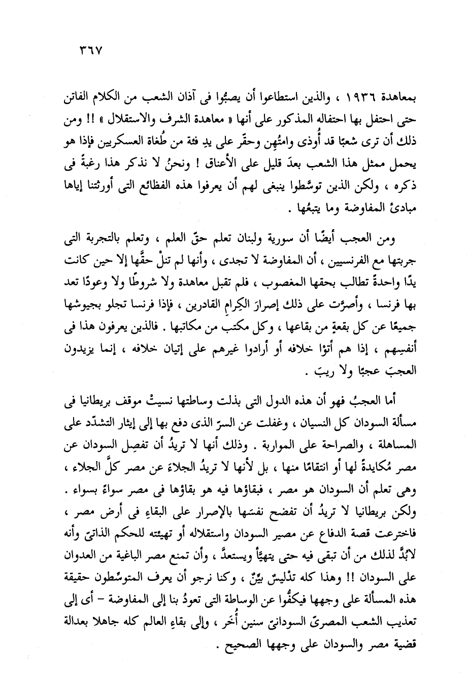 ومن العجب أيضًا أن سورية ولبنان تعلم حقّ العلم، وتعلم بالتجربة التي جربتها مع الفرنسيين، أن المفاوضة لا تجدى، وأنها لم تنلْ حقَّها إلا حين كانت يدًا واحدة تطالب بحقها المغصوب، فلم تقبل معاهدة ولا شروطًا ولا وعودًا تعد بها فرنسا، وأصرَّت على ذلك إصرارَ الكِرامِ القادرين، فإذا فرنسا تجلو بجيوشها جميعًا عن كل بقعةٍ من بقاعها، وكل مكتب من مكاتبها. فالذين يعرفون هذا في أنفسِهم، إذا هم أتوا خلافه أو أرادوا غيرهم على إتيان خلافه، إنما يزيدون العجبَ عجبًا ولا ريبَ.