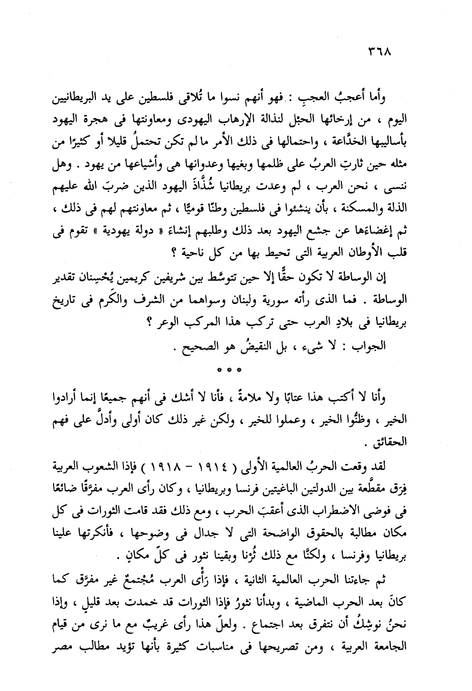 وأما أعجبُ العجبِ: فهو أنهم نسوا ما تُلاقي فلسطين على يد البريطانيين اليوم، من إرخائها الحبْل لنذالة الإرهاب اليهودي ومعاونتها في هجرة اليهود بأساليبها الخدَّاعة، واحتمالها في ذلك الأمر ما لم تكن تحتملُ قليلا أو كثيرًا من مثله حين ثارتِ العربُ على ظلمها وبغيها وعدوانها هي وأشياعها من يهود. وهل ننسى، نحن العرب، لم وعدت بريطانيا شُذَّاذَ اليهود الذين ضربَ الله عليهم الذلة والمسكنة، بأن ينشئوا في فلسطين وطنًا قومًّا، ثم معاونتهم لهم في ذلك، ثم إغضاءَها عن جشع اليهود بعد ذلك وطلبهم إنشاءَ "دولة يهودية" تقوم في قلب الأوطان العربية التي تحيط بها من كل ناحية؟