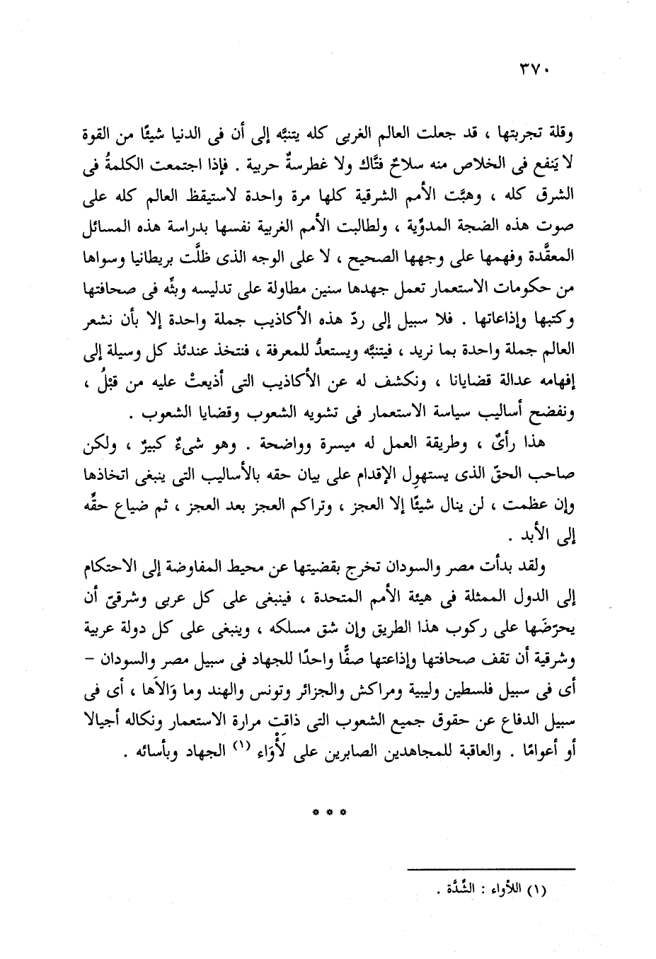 ولقد بدأت مصر والسودان تخرج بقضيتها عن محيط المفاوضة إلى الاحتكام إلى الدول الممثلة في هيئة الأمم المتحدة، فينبغي على كل عربي وشرقيّ أن يحرّضَها على ركوب هذا الطريق وإن شق مسلكه، وينبغي على كل دولة عربية وشرقية أن تقف صحافتها وإذاعتها صفًّا واحدًا للجهاد في سبيل مصر والسودان -أي في سبيل فلسطين وليبية ومراكش والجزائر وتونس والهند وما وَالَاها، أي في سبيل الدفاع عن حقوق جميع الشعوب التي ذاقت مرارة الاستعمار ونكاله أجيالا أو أعوامًا. والعاقبة للمجاهدين الصابرين على لَأْوَاء (¬1) الجهاد وبأسائه.