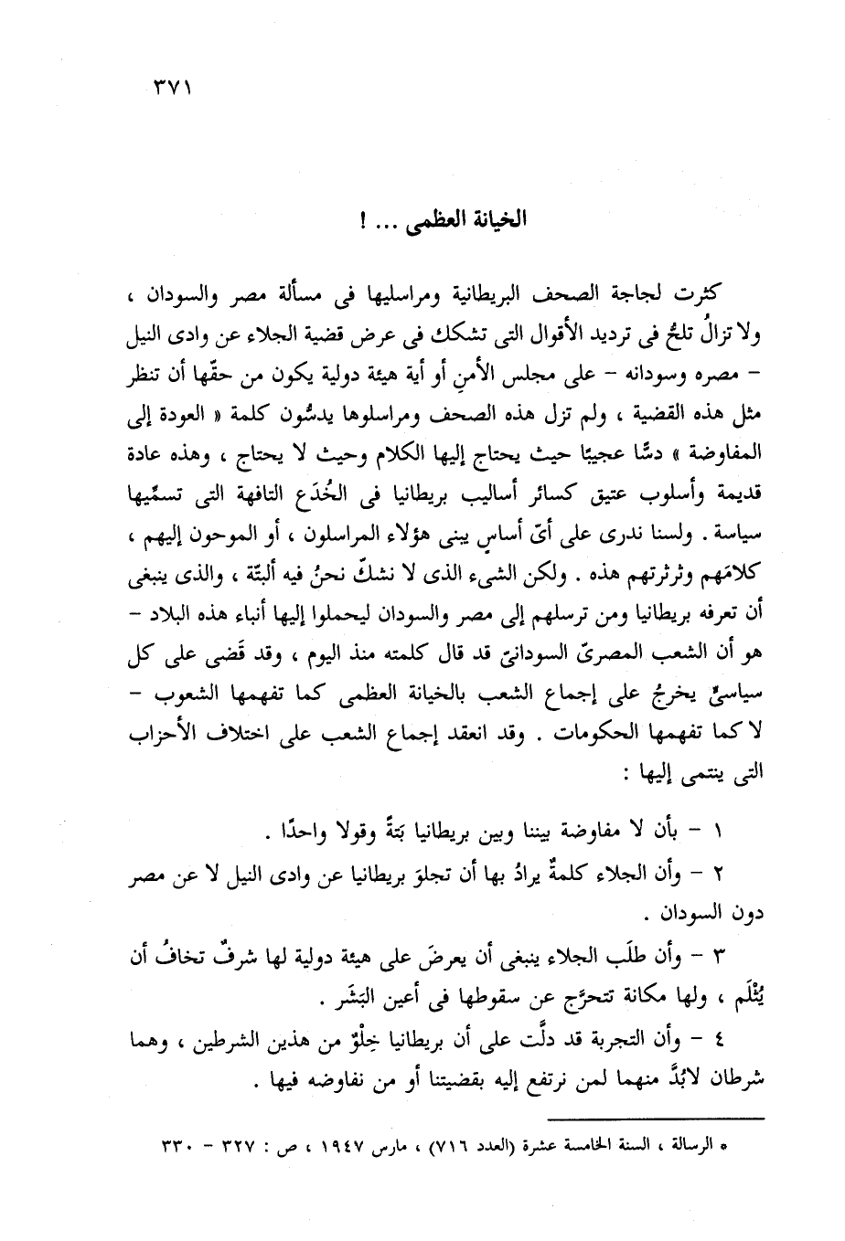 2 - وأن الجلاء كلمةٌ يرادُ بها أن تجلوَ بريطانيا عن وادي النيل لا عن مصر دون السودان.