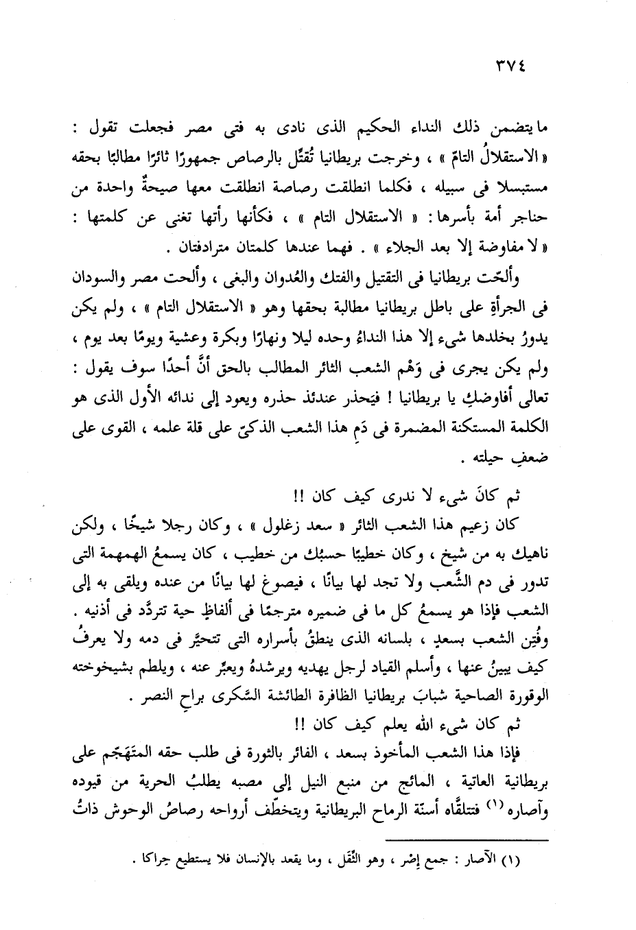 ما يتضمن ذلك النداء الحكيم الَّذي نادى به فتى مصر فجعلت تقول: "الاستقلالُ التام"، وخرجت بريطانيا تُقتِّل بالرصاص جمهورًا ثائرًا مطالبًا بحقه مستبسلًا في سبيله، فكلما انطلقت رصاصة انطلقت معها صيحةٌ واحدة من حناجر أمة بأسرها: "الاستقلال التام"، فكأنها رأتها تغني عن كلمتها: "لا مفاوضة إلا بعد الجلاء". فهما عندها كلمتان مترادفتان.