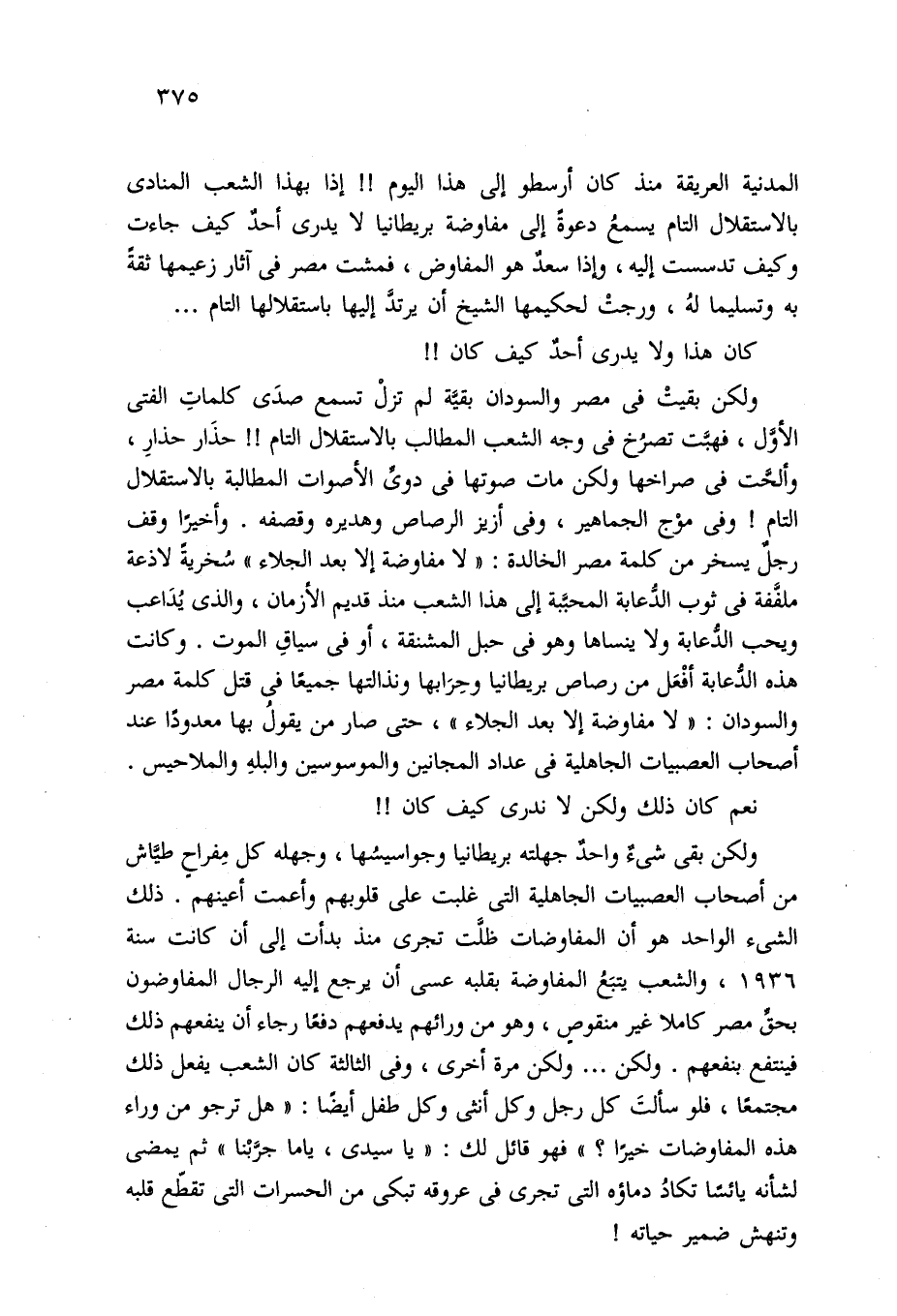 ولكن بقي شيءٌ واحدٌ جهلته بريطانيا وجواسيسُها، وجهله كل مِفراحٍ طيَّاش من أصحاب العصبيات الجاهلية التي غلبت على قلوبهم وأعمت أعينهم. ذلك الشيء الواحد هو أن المفاوضات ظلَّت تجرى منذ بدأت إلى أن كانت سنة 1936، والشعب يتبَعُ المفاوضة بقلبه عسى أن يرجع إليه الرجال المفاوضون بحق مصر كاملا غير منقوصٍ، وهو من ورائهم يدفعهم دفعًا رجاء أن ينفعهم ذلك فينتفع بنفعهم. ولكن. . . ولكن مرة أخرى، وفي الثالثة كان الشعب يفعل ذلك مجتمعًا، فلو سألتَ كل رجل وكل أنثى وكل طفل أيضًا: "هل ترجو من وراء هذه المفاوضات خيرًا؟ " فهو قائل لك: "يا سيدى، ياما جرَّبْنا" ثم يمضي لشأنه يائسًا تكادُ دماؤه التي تجري في عروقه تبكي من الحسرات التي تقطّع قلبه وتنهش ضمير حياته!
