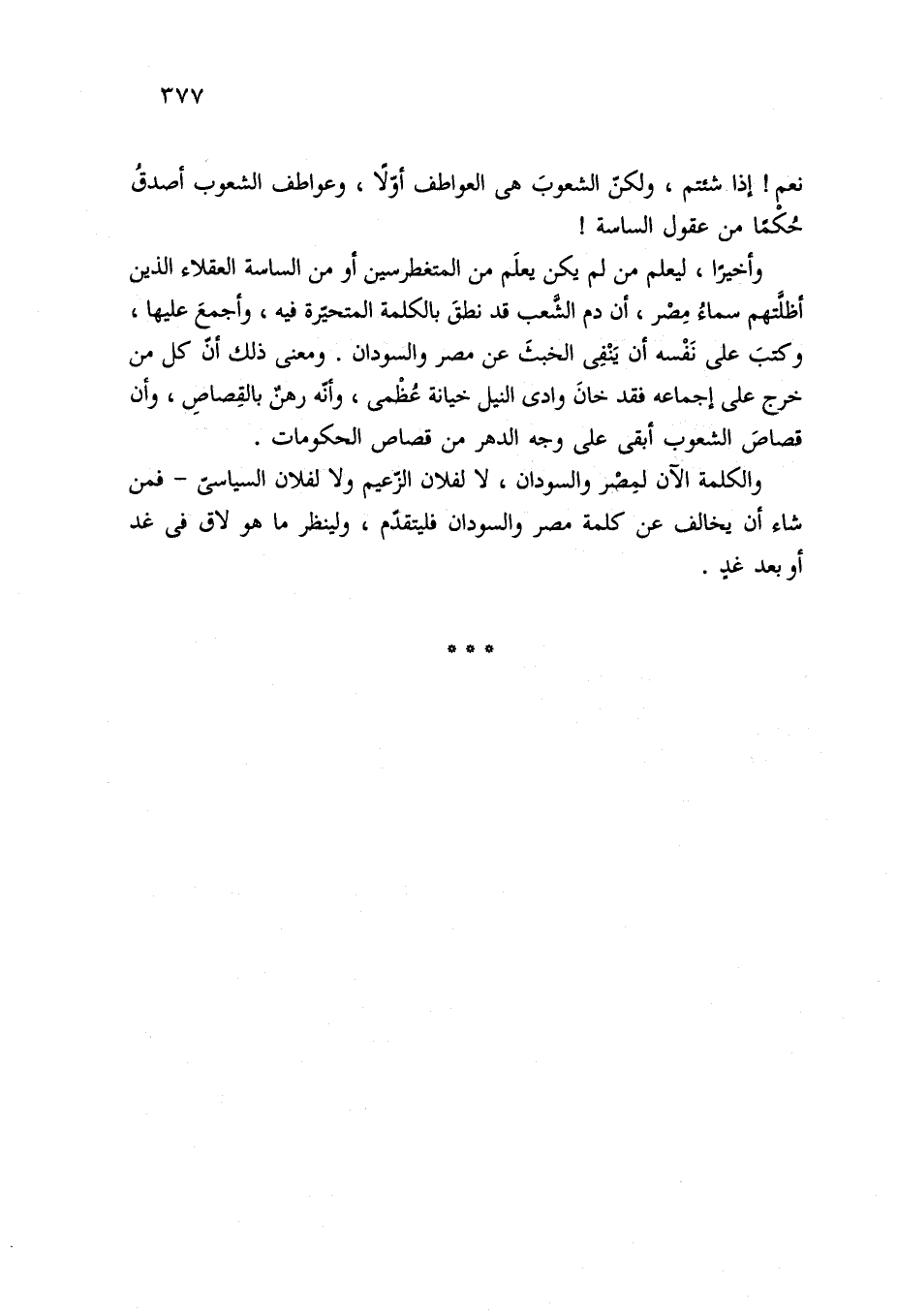 وأخيرًا، ليعلم من لم يكن يعلَم من المتغطرسين أو من الساسة العقلاء الذين أظلَّتهم سماءُ مِصْر، أن دم الشَّعب قد نطقَ بالكلمة المتحيّرة فيه، وأجمعَ عليها، وكتبَ على نَفْسه أن يَنْفِي الخبثَ عن مصر والسودان. ومعنى ذلك أنَّ كل من خرج على إجماعه فقد خانَ وادي النيل خيانة عُظْمى، وأنّه رهنٌ بالقِصاصِ، وأن قصاصَ الشعوب أبقى على وجه الدهر من قصاص الحكومات.