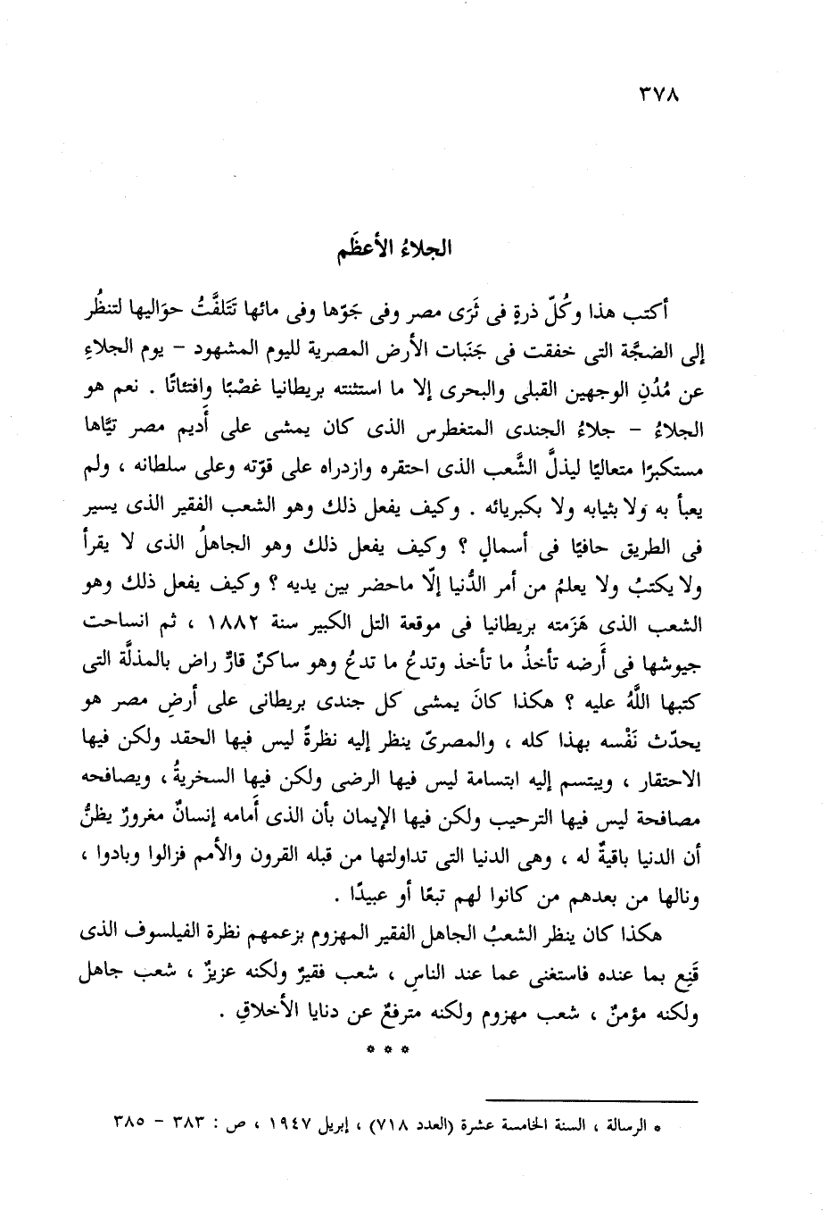 أكتب هذا وكُلّ ذرةٍ في ثَرَى مصر وفي جَوّها وفي مائها تَتَلفَّتُ حوَاليها لتنظُر إلى الضجَّة التي خفقت في جَنَبات الأرض المصرية لليوم المشهود -يوم الجلاءِ عن مُدُنِ الوجهين القبلي والبحري إلا ما استثنته بريطانيا غصْبًا وافتئاتًا. نعم هو الجلاءُ- جلاءُ الجندي المتغطرس الَّذي كان يمشي على أَديم مصر تيَّاها مستكبرًا متعاليًا ليذلَّ الشَّعب الَّذي احتقره وازدراه على قوّته وعلى سلطانه، ولم يعبأ به ؤلا بثيابه ولا بكبريائه. وكيف يفعل ذلك وهو الشعب الفقير الَّذي يسير في الطريق حافيًا في أسمالٍ؟ وكيف يفعل ذلك وهو الجاهلُ الَّذي لا يقرأ ولا يكتبُ ولا يعلمُ من أمر الدُّنيا إلّا ما حضر بين يديه؟ وكيف يفعل ذلك وهو الشعب الَّذي هَزَمته بريطانيا في موقعة التل الكبير سنة 1882، ثم انساحت جيوشها في أَرضه تأخذُ ما تأخذ وتدعُ ما تدعُ وهو ساكنٌ قارٌّ راضٍ بالمذلَّة التي كتبها اللَّهُ عليه؟ هكذا كانَ يمشي كل جندي بريطاني على أرضِ مصر هو يحدّث نَفْسه بهذا كله، والمصريّ ينظر إليه نظرة ليس فيها الحقد ولكن فيها الاحتقار، ويبتسم إليه ابتسامة ليس فيها الرضى ولكن فيها السخريةُ، ويصافحه مصافحة ليس فيها الترحيب ولكن فيها الإيمان بأن الَّذي أَمامه إنسانٌ مغرورٌ يظنُّ أن الدنيا باقيةٌ له، وهي الدنيا التي تداولتها من قبله القرون والأمم فزالوا وبادوا، ونالها من بعدهم من كانوا لهم تبعًا أو عبيدًا.