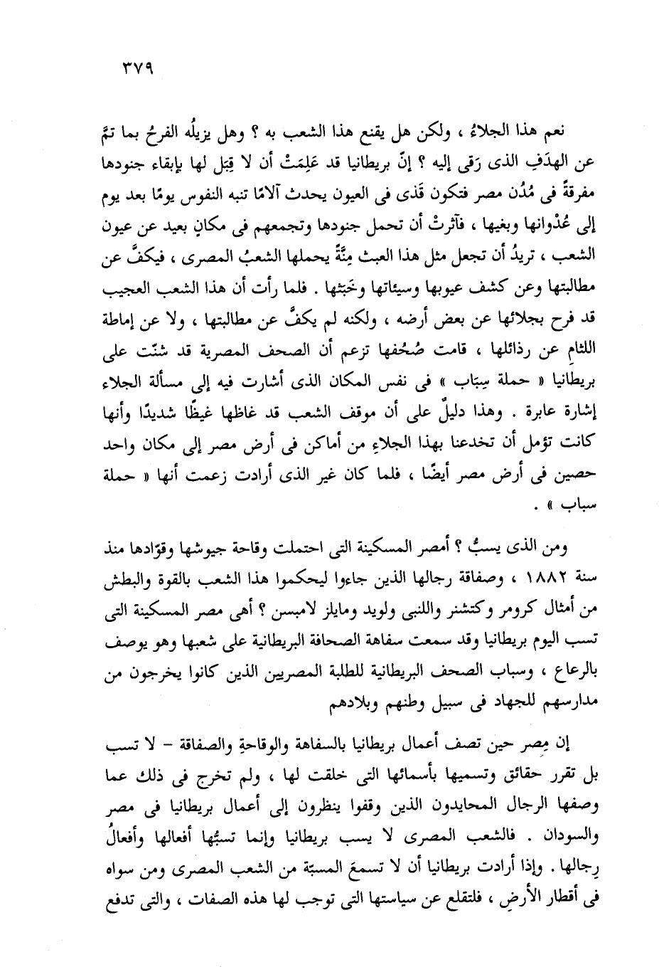 ومن الَّذي يسبُّ؟ أمصر المسكينة التي احتملت وقاحة جيوشها وقوّادها منذ سنة 1882، وصفاقة رجالها الذين جاءوا ليحكموا هذا الشعب بالقوة والبطش من أمثال كرومر وكتشنر واللنبى ولويد ومايلز لامبسن؟ أهي مصر المسكينة التي تسب اليوم بريطانيا وقد سمعت سفاهة الصحافة البريطانية على شعبها وهو يوصف بالرعاع، وسباب الصحف البريطانية للطلبة المصريين الذين كانوا يخرجون من مدارسهم للجهاد في سبيل وطنهم وبلادهم.