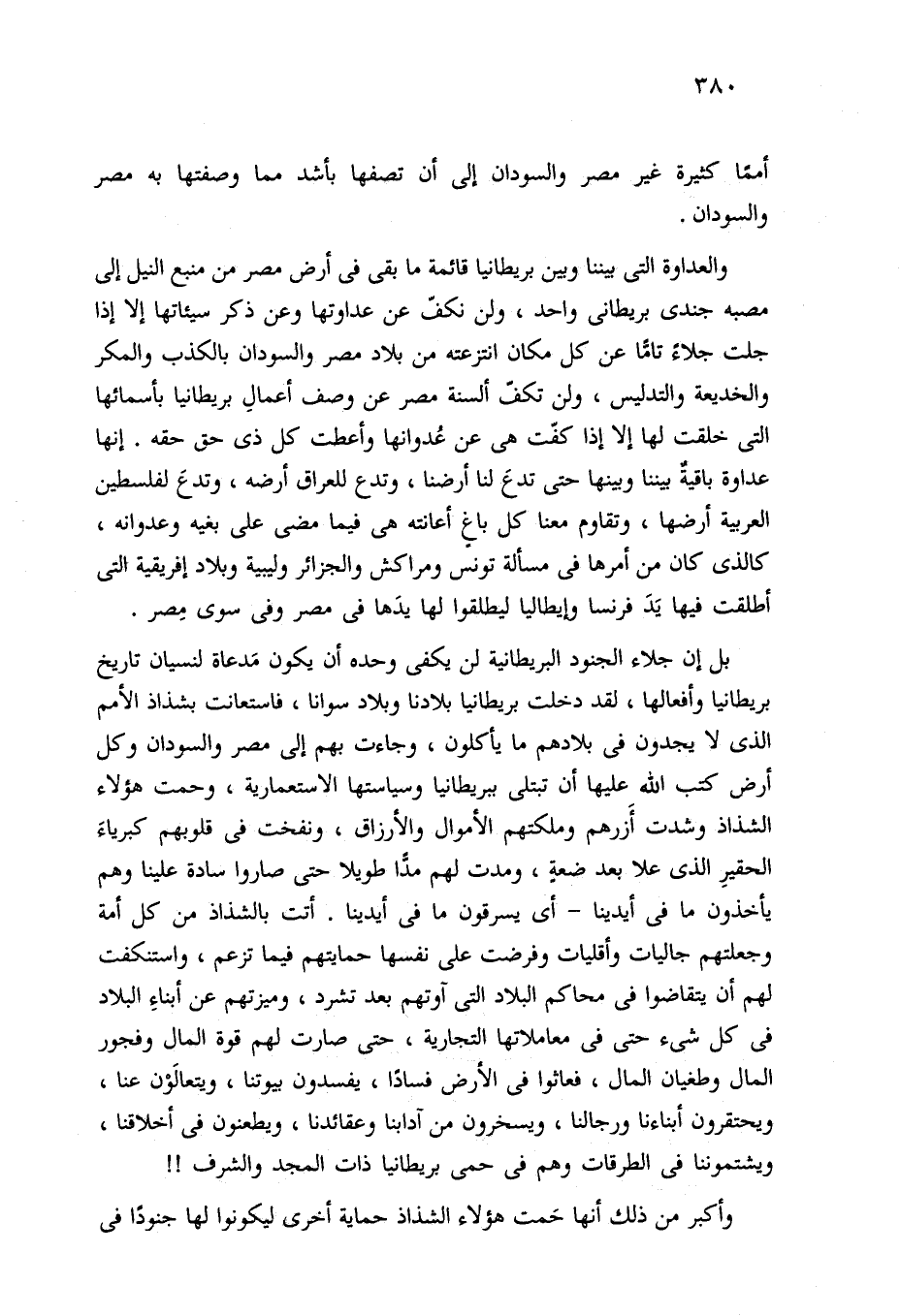 والعداوة التي بيننا وبين بريطانيا قائمة ما بقى في أرض مصر من منبع النيل إلى مصبه جندي بريطاني واحد، ولن نكفّ عن عداوتها وعن ذكر سيئاتها إلا إذا جلت جلاءً تامًّا عن كل مكان انتزعته من بلاد مصر والسودان بالكذب والمكر والخديعة والتدليس، ولن تكفّ ألسنة مصر عن وصف أعمالِ بريطانيا بأسمائها التي خلقت لها إلا إذا كفّت هي عن عُدوانها وأعطت كل ذي حق حقه. إنها عداوة باقيةٌ بيننا وبينها حتَّى تدعَ لنا أرضنا، وتدع للعراق أرضه، وتدعَ لفلسطين العربية أرضها، وتقاوم معنا كل باغٍ أعانته هي فيما مضى على بغيه وعدوانه، كالذي كان من أمرها في مسألة تونس ومراكش والجزائر وليبية وبلاد إفريقية التي أطلقت فيها يَدَ فرنسا وإيطاليا ليطلقوا لها يدَها في مصر وفي سوى مِصر.