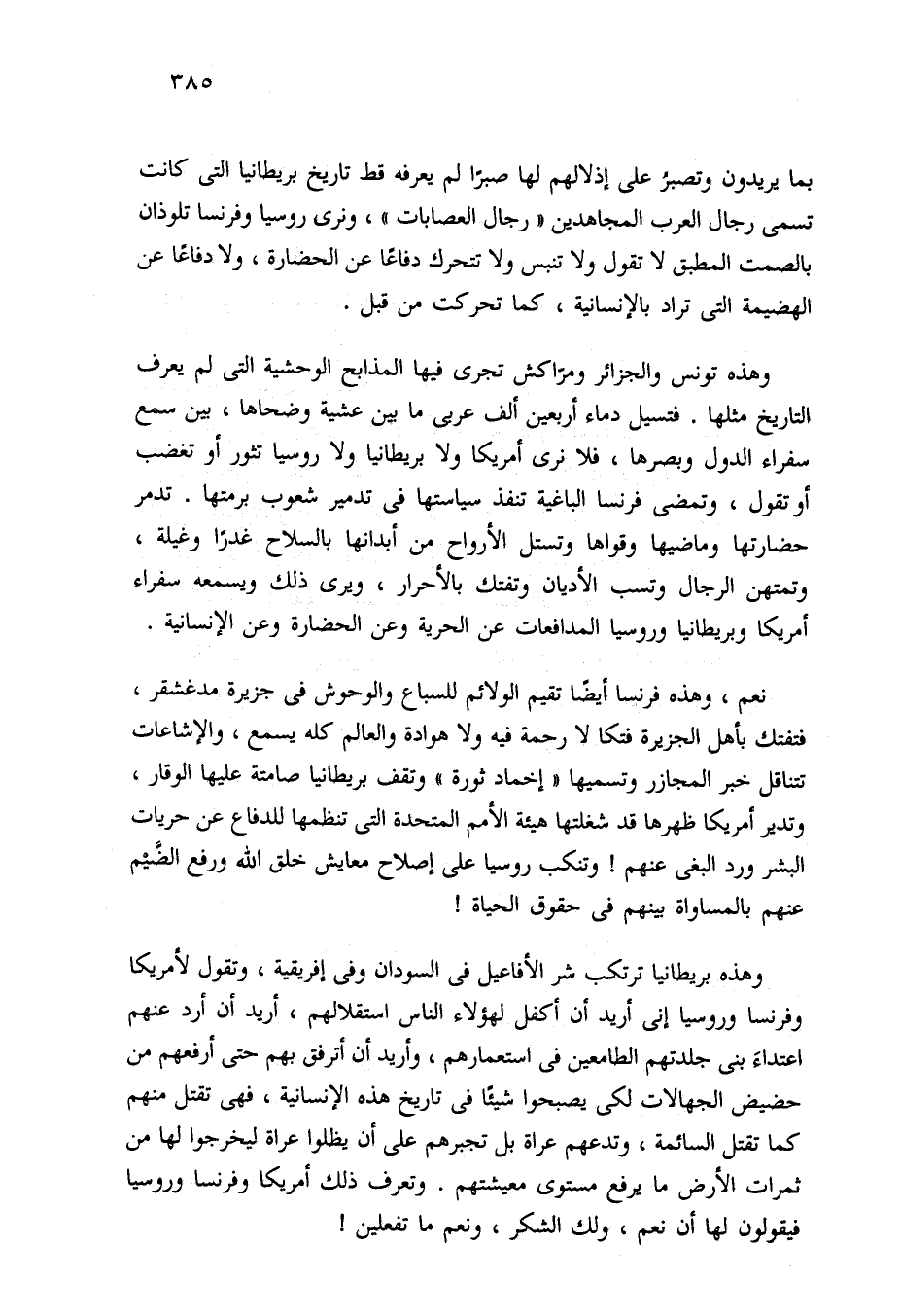 وهذه تونس والجزائر ومراكش تجرى فيها المذابح الوحشية التي لم يعرف التاريخ مثلها. فتسيل دماء أربعين ألف عربي ما بين عشية وضحاها، بين سمع سفراء الدول وبصرها، فلا نرى أمريكا ولا بريطانيا ولا روسيا تثور أو تغضب أو تقول، وتمضي فرنسا الباغية تنفذ سياستها في تدمير شعوب برمتها. تدمر حضارتها وماضيها وقواها وتستل الأرواح من أبدانها بالسلاح غدرًا وغيلة، وتمتهن الرجال وتسب الأديان وتفتك بالأحرار، ويرى ذلك ويسمعه سفراء أمريكا وبريطانيا وروسيا المدافعات عن الحرية وعن الحضارة وعن الإنسانية.