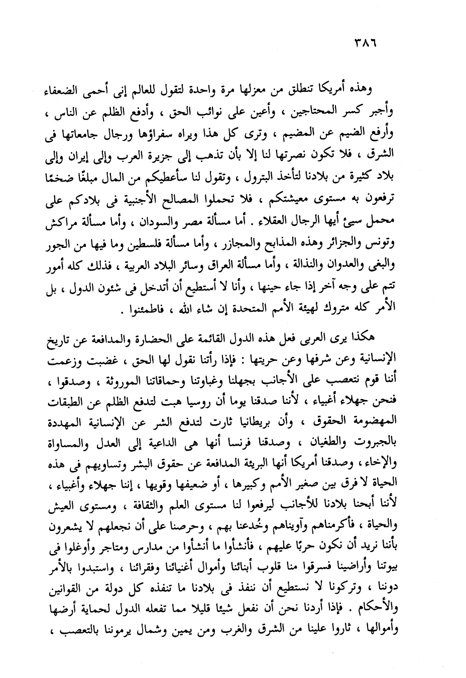 وهذه أمريكا تنطلق من معزلها مرة واحدة لتقول للعالم إني أحمي الضعفاء وأجبر كسر المحتاجين، وأعين على نوائب الحق، وأدفع الظلم عن الناس، وأرفع الضيم عن المضيم، وترى كل هذا ويراه سفراؤها ورجال جامعاتها في الشرق، فلا تكون نصرتها لنا إلا بأن تذهب إلى جزيرة العرب وإلى إيران وإلى بلاد كثيرة من بلادنا لتأخذ البترول، وتقول لنا سأعطيكم من المال مبلغًا ضخمًا ترفعون به مستوى معيشتكم، فلا تحملوا المصالح الأجنبية في بلادكم على محمل سيء أيها الرجال العقلاء. أما مسألة مصر والسودان، وأما مسألة مراكش وتونس والجزائر وهذه المذابح والمجازر، وأما مسألة فلسطين وما فيها من الجور والبغي والعدوان والنذالة، وأما مسألة العراق وسائر البلاد العربية، فذلك كله أمور تتم على وجه آخر إذا جاء حينها، وأنا لا أستطيع أن أتدخل في شئون الدول، بل الأمر كله متروك لهيئة الأمم المتحدة إن شاء الله، فاطمئنوا.