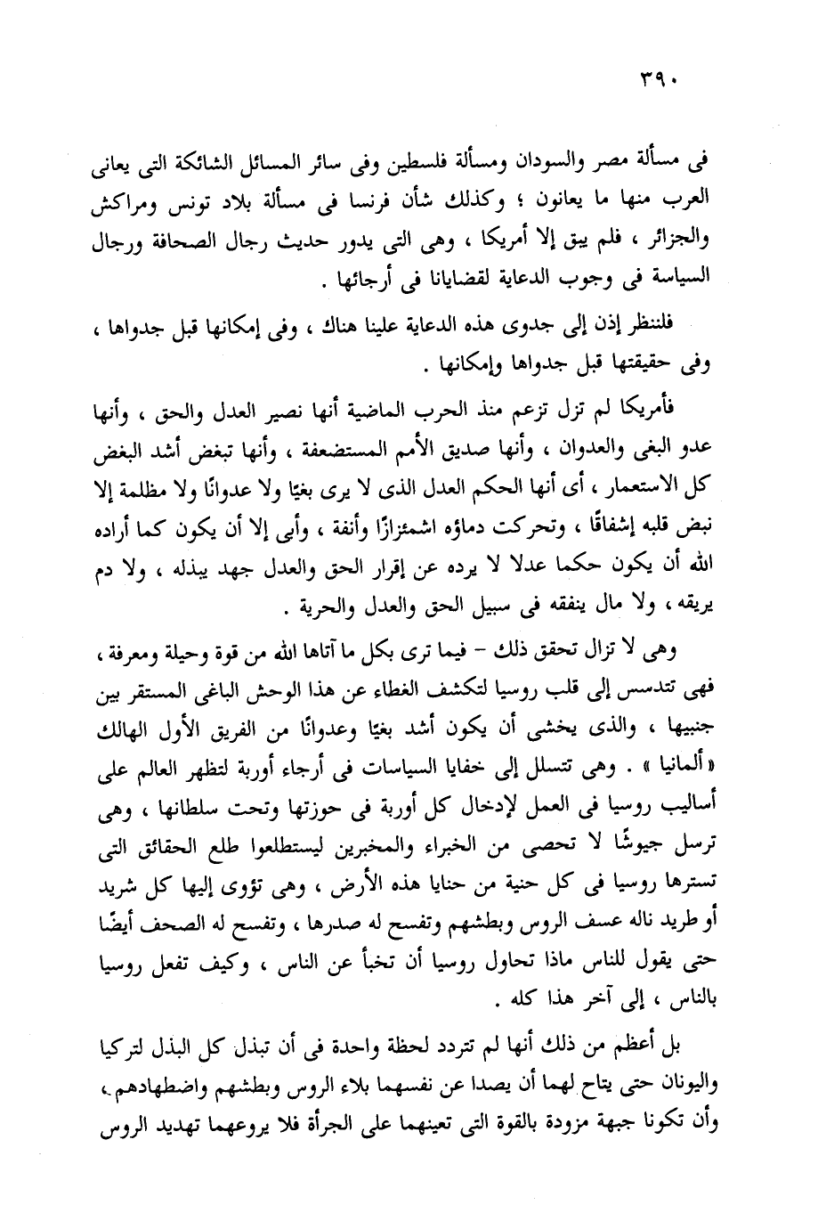 في مسألة مصر والسودان ومسألة فلسطين وفي سائر المسائل الشائكة التي يعاني العرب منها ما يعانون؛ وكذلك شأن فرنسا في مسألة بلاد تونس ومراكش والجزائر، فلم يبق إلا أمريكا، وهي التي يدور حديث رجال الصحافة ورجال السياسة في وجوب الدعاية لقضايانا في أرجائها.
