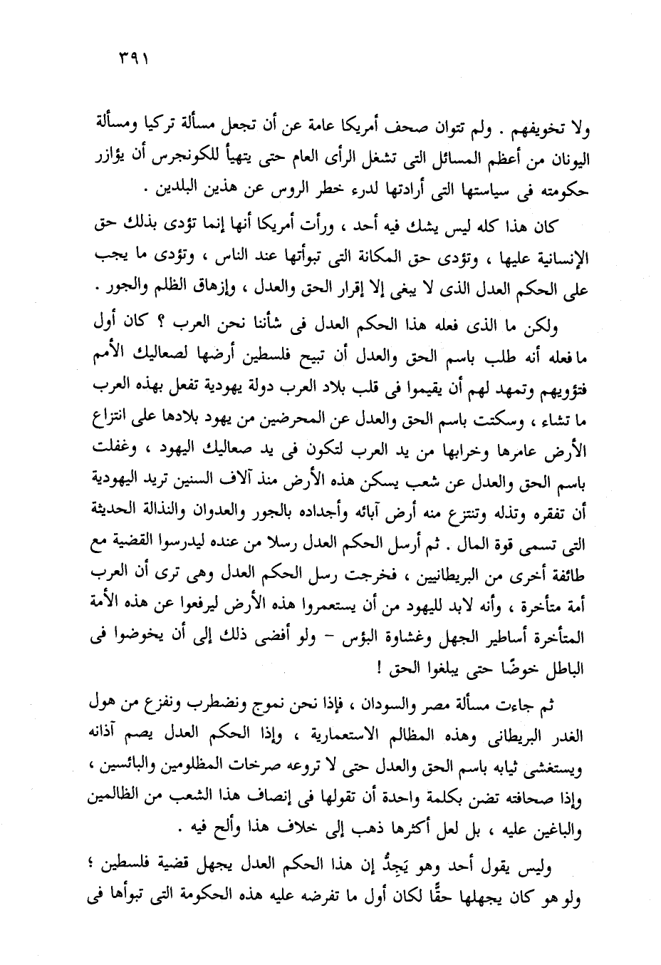 ولكن ما الَّذي فعله هذا الحكم العدل في شأننا نحن العرب؟ كان أول ما فعله أنَّه طلب باسم الحق والعدل أن تبيح فلسطين أرضها لصعاليك الأمم فتؤويهم وتمهد لهم أن يقيموا في قلب بلاد العرب دولة يهودية تفعل بهذه العرب ما تشاء، وسكتت باسم الحق والعدل عن المحرضين من يهود بلادها على انتزاع الأرض عامرها وخرابها من يد العرب لتكون في يد صعاليك اليهود، وغفلت باسم الحق والعدل عن شعب يسكن هذه الأرض منذ آلاف السنين تريد اليهودية أن تفقره وتذله وتنتزع منه أرض آبائه وأجداده بالجور والعدوان والنذالة الحديثة التي تسمى قوة المال. ثم أرسل الحكم العدل رسلا من عنده ليدرسوا القضية مع طائفة أخرى من البريطانيين، فخرجت رسل الحكم العدل وهي ترى أن العرب أمة متأخرة، وأنه لابد لليهود من أن يستعمروا هذه الأرض ليرفعوا عن هذه الأمة المتأخرة أساطير الجهل وغشاوة البؤس - ولو أفضى ذلك إلى أن يخوضوا في الباطل خوضًا حتَّى يبلغوا الحق!