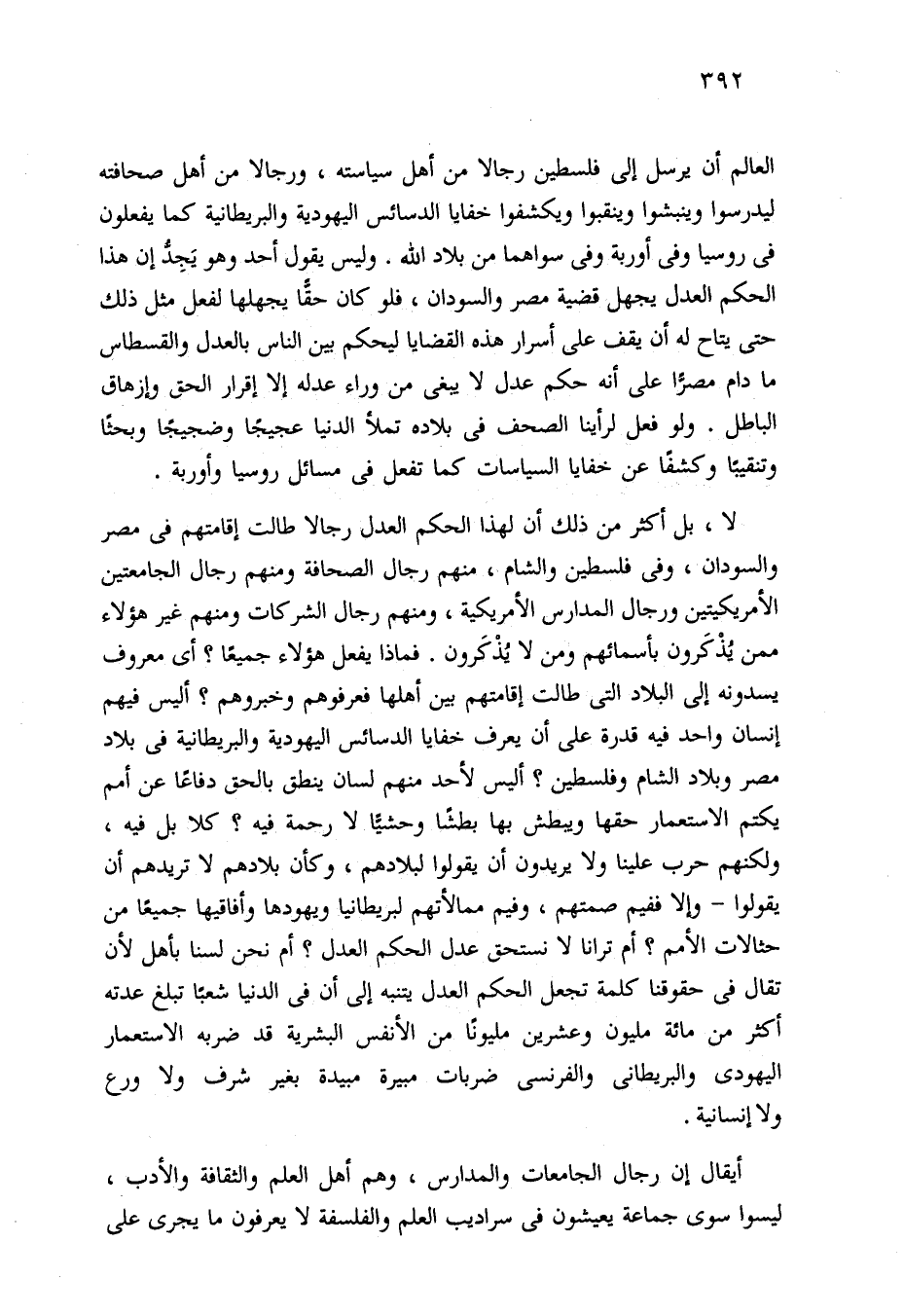 لا، بل أكثر من ذلك أن لهذا الحكم العدل رجالا طالت إقامتهم في مصر والسودان، وفي فلسطين والشام، منهم رجال الصحافة ومنهم رجال الجامعتين الأمريكيتين ورجال المدارس الأمريكية، ومنهم رجال الشركات ومنهم غير هؤلاء ممن يُذْكَرون بأسمائهم ومن لا يُذْكَرون. فماذا يفعل هؤلاء جميعًا؟ أي معروف يسدونه إلى البلاد التي طالت إقامتهم بين أهلها فعرفوهم وخبروهم؟ أليس فيهم إنسان واحد فيه قدرة على أن يعرف خفايا الدسائس اليهودية والبريطانية في بلاد مصر وبلاد الشام وفلسطين؟ أليس لأحد منهم لسان ينطق بالحق دفاعًا عن أمم يكتم الاستعمار حقها ويبطش بها بطشًا وحشيًّا لا رحمة فيه؟ كلا بل فيه، ولكنهم حرب علينا ولايريدون أن يقولوا لبلادهم، وكأن بلادهم لا تريدهم أن يقولوا -وإلا ففيم صمتهم، وفيم ممالأتهم لبريطانيا ويهودها وأفاقيها جميعًا من حثالات الأمم؟ أم ترانا لا نستحق عدل الحكم العدل؟ أم نحن لسنا بأهل لأن تقال في حقوقنا كلمة تجعل الحكم العدل يتنبه إلى أن في الدنيا شعبًا تبلغ عدته أكثر من مائة مليون وعشرين مليونًا من الأنفس البشرية قد ضربه الاستعمار اليهودي والبريطاني والفرنسي ضربات مبيرة مبيدة بغير شرف ولا ورع ولا إنسانية.