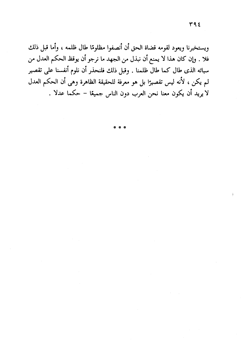ويستخبرنا ويعود لقومه قضاة الحق أن أنصفوا مظلومًا طال ظلمه، وأما قبل ذلك فلا. وإن كان هذا لا يمنع أن نبذل من الجهد ما نرجو أن يوقظ الحكم العدل من سباته الَّذي طال كما طال ظلمنا. وقبل ذلك فلنحذر أن نلوم أنفسنا على تقصير لم يكن، لأنه ليس تقصيرًا بل هو معرفة للحقيقة الظاهرة وهي أن الحكم العدل لا يريد أن يكون معنا نحن العرب دون الناس جميعًا - حكما عدلًا.