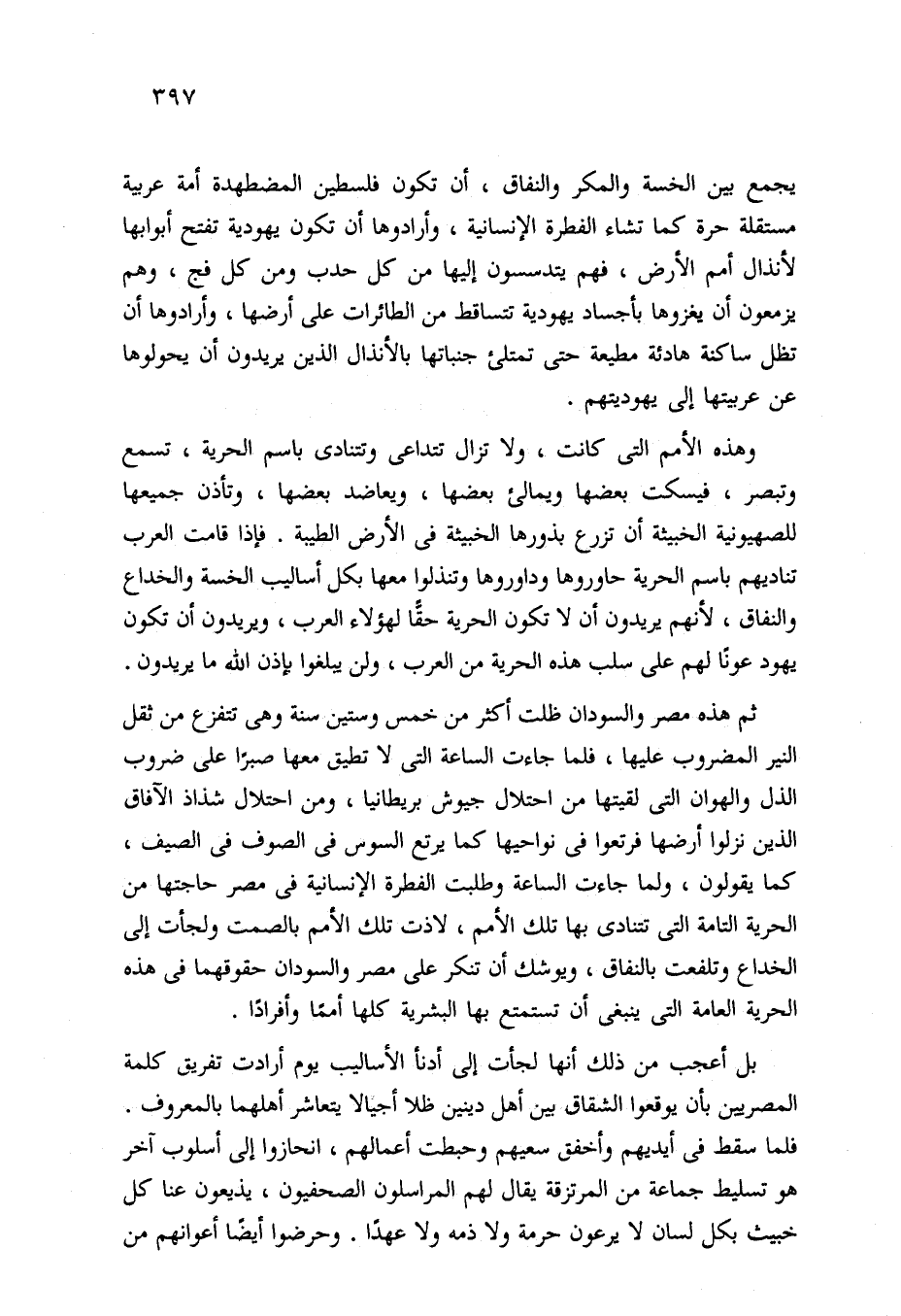يجمع بين الخسة والمكر والنفاق، أن تكون فلسطين المضطهدة أمة عربية مستقلة حرة كما تشاء الفطرة الإنسانية، وأرادوها أن تكون يهودية تفتح أبوابها لأنذال أمم الأرض، فهم يتدسسون إليها من كل حدب ومن كل فج، وهم يزمعون أن يغزوها بأجساد يهودية تتساقط من الطائرات على أرضها، وأرادوها أن تظل ساكنة هادئة مطيعة حتَّى تمتلئ جنباتها بالأنذال الذين يريدون أن يحولوها عن عربيتها إلى يهوديتهم.