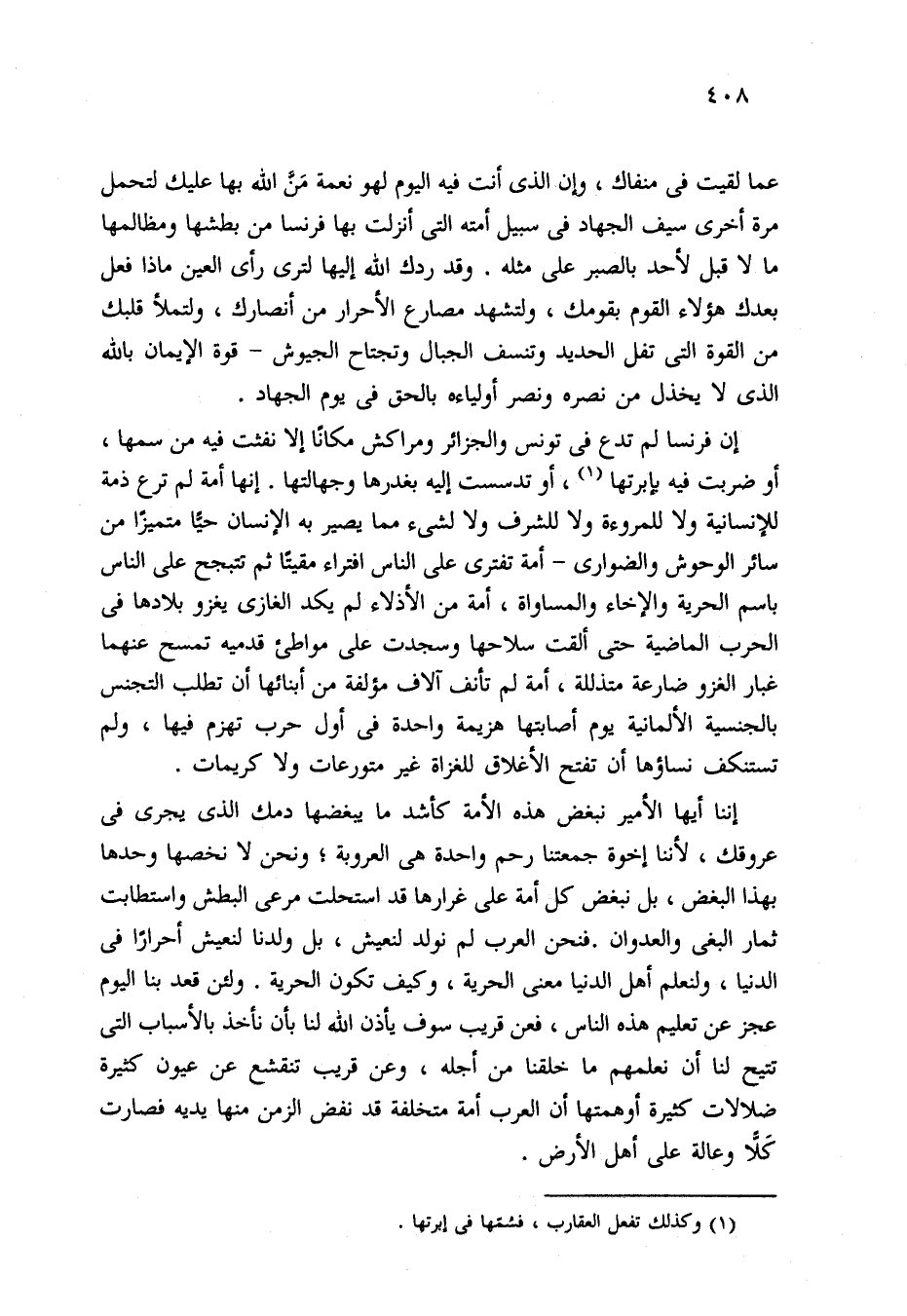 عما لقيت في منفاك، وإن الَّذي أنت فيه اليوم لهو نعمة مَنَّ الله بها عليك لتحمل مرة أخرى سيف الجهاد في سبيل أمته التي أنزلت بها فرنسا من بطشها ومظالمها ما لا قبل لأحد بالصبر على مثله. وقد ردك الله إليها لترى رأي العين ماذا فعل بعدك هؤلاء القوم بقومك، ولتشهد مصارع الأحرار من أنصارك، ولتملأ قلبك من القوة التي تفل الحديد وتنسف الجبال وتجتاح الجيوش - قوة الإيمان بالله الَّذي لا يخذل من نصره ونصر أولياءه بالحق في يوم الجهاد.