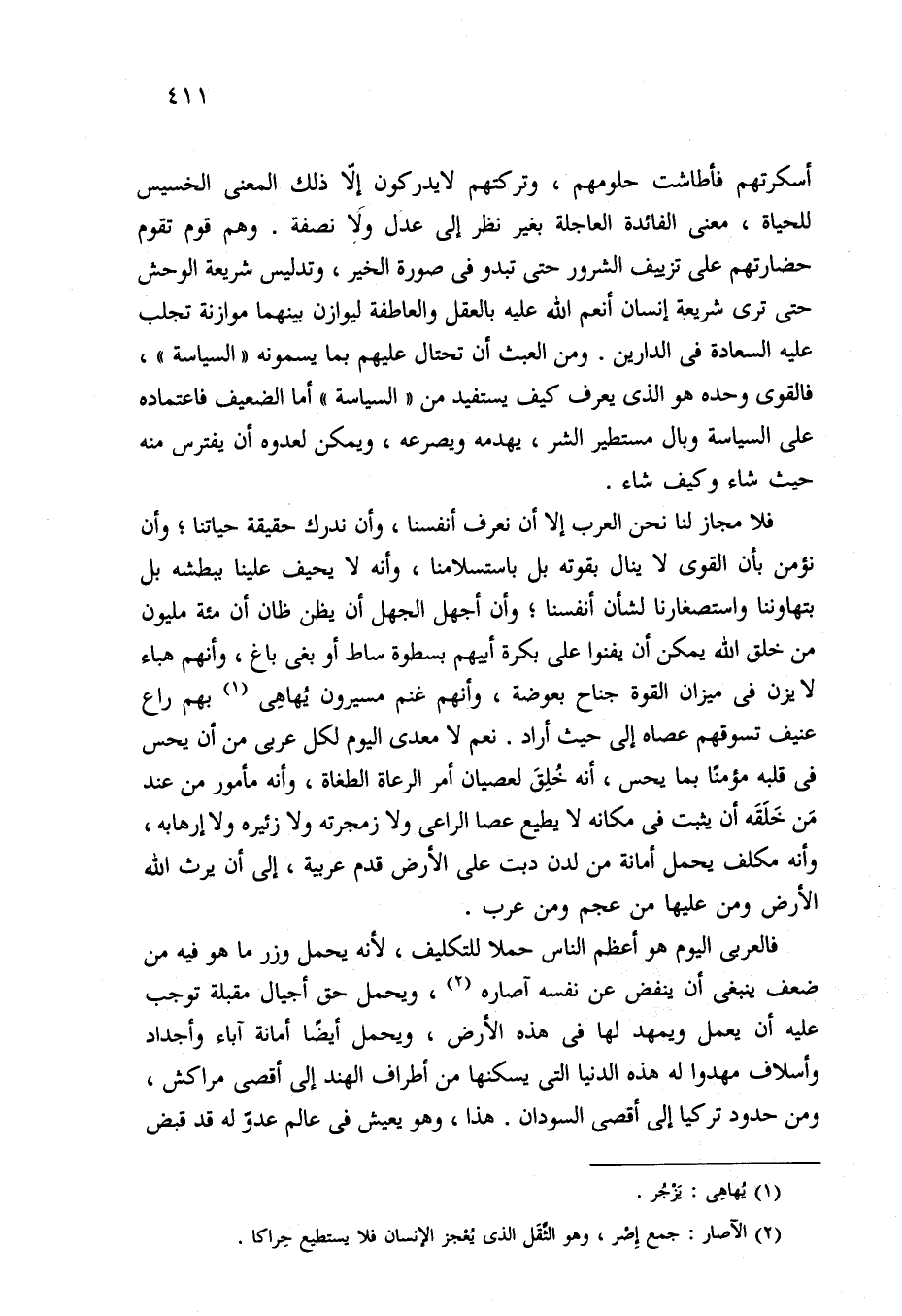 أسكرتهم فأطاشت حلومهم، وتركتهم لا يدركون إلّا ذلك المعنى الخسيس للحياة، معنى الفائدة العاجلة بغير نظر إلى عدل وَلا نصفة. وهم قوم تقوم حضارتهم على تزييف الشرور حتى تبدو في صورة الخير، وتدليس شريعة الوحش حتى ترى شريعة إنسان أنعم الله عليه بالعقل والعاطفة ليوازن بينهما موازنة تجلب عليه السعادة في الدارين. ومن العبث أن تحتال عليهم بما يسمونه "السياسة"، فالقوى وحده هو الذي يعرف كيف يستفيد من "السياسة" أما الضعيف فاعتماده على السياسة وبال مستطير الشر، يهدمه ويصرعه، ويمكن لعدوه أن يفترس منه حيث شاء وكيف شاء.