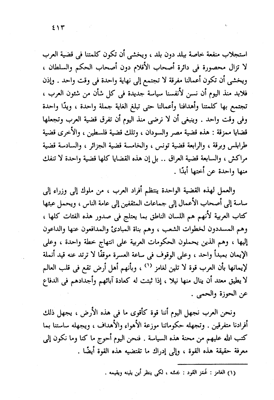 استجلاب منفعة خاصة ببلد دون بلد، ويخشى أن تكون كلمتنا في قضية العرب لا تزال محصورة في دائرة أصحاب الأقلام دون أصحاب الحكم والسلطان، ويخشى أن تكون أعمالنا مفرقة لا تجتمع إلى نهاية واحدة في وقت واحد. وإذن فلابد منذ اليوم أن نسن لأنفسنا سياسة جديدة في كل شأن من شئون العرب، تجتمع بها كلمتنا وأهدافنا وأعمالنا حتى تبلغ الغاية جملة واحدة، ويدًا واحدة وفي وقت واحد. وينبغي أن لا نرضى منذ اليوم أن تفرق قضية العرب وتجعلها قضايا ممزقة: هذه قضية مصر والسودان، وتلك قضية فلسطين، والأخرى قضية طرابلس وبرقة، والرابعة قضية تونس، والخامسة قضية الجزائر، والسادسة قضية مراكش، والسابعة قضية العراق .. بل إن هذه القضايا كلها قضية واحدة لا تنفك منها واحدة عن أختها أبدًا.
