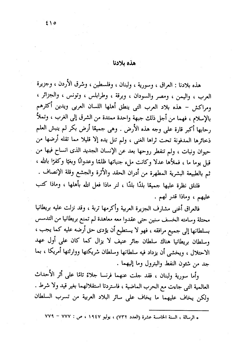 هذه بلادنا: العراق، وسورية، ولبنان، وفلسطن، وشرق الأردن، وجزيرة العرب، واليمن، ومصر والسودان، وبرقة، وطرابلس، وتونس، والجزائر، ومراكش -هذه بلاد العرب التي ينطق أهلها اللسان العربي ويدين أكثرهم بالإسلام، فهما من أجل ذلك جبهة واحدة ممتدة من الشرق إلى الغرب، وتملأ رحابها أكبر قارة على وجه هذه الأرض. وهي جميعًا أرض بكر لم ينبش العلم ذخائرها المدفونة تحت ثراها الغني، ولم تنل يده إلا قليلا مما تقله أرضها من حيوان ونبات، ولم تنفطر روحها بعد عن الإنسان الجديد الذي انساح فيها من قبل يوما ما، فملأها عدلا وكانت ملء جنباتها ظلمًا وعدوانًا وبغيًا وكفرًا بالله، ثم بالطبيعة البشرية المطهرة من أدران الحقد والأثرة والجشع وقلة الإنصاف.